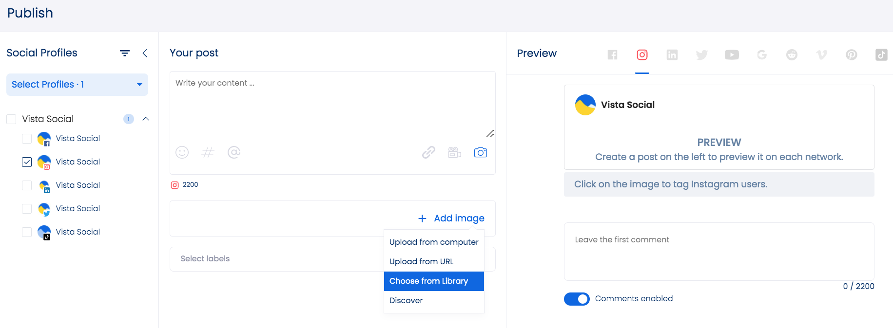 - Click the Publish tab on the left side of the dashboard and select Instagram from your list of profiles.