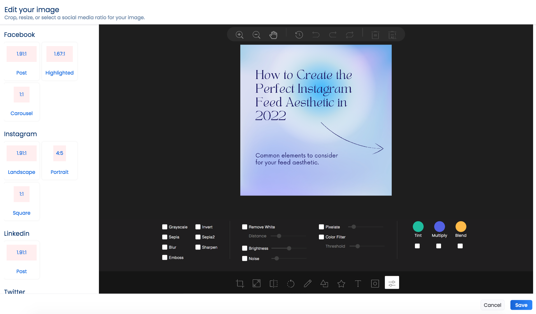 4.2 Edit your image – crop, resize, select a social media ratio for your photo, add filters, draw on, or add text or icons to each image.