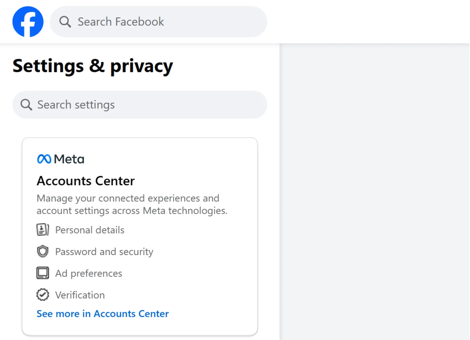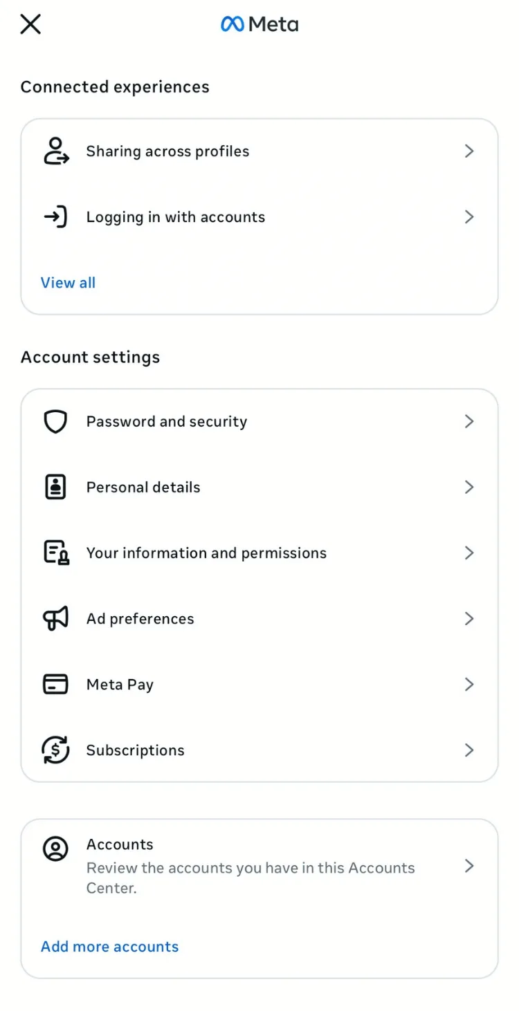 - Select Settings and tap See more in Accounts Center under the Meta Accounts Center section.