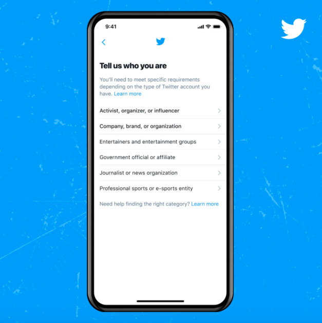 Twitter notes that there are only six categories of accounts that can qualify for the verification checkmark: