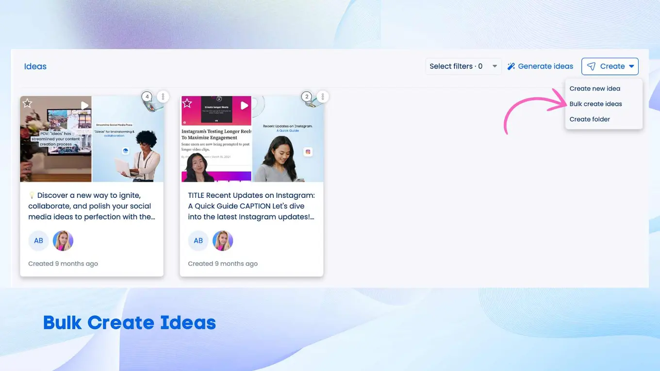 - Bulk Create Ideas: Save time by generating multiple ideas at once, perfect for brainstorming sessions or campaign kickoffs.
