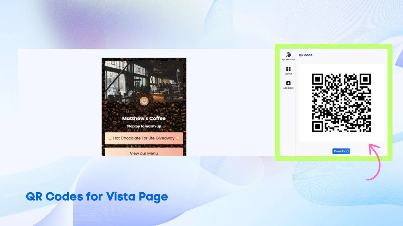 - QR Codes for Vista Pages: Generate and download QR codes for your bio link microsites, making bridging offline and online marketing efforts easier.