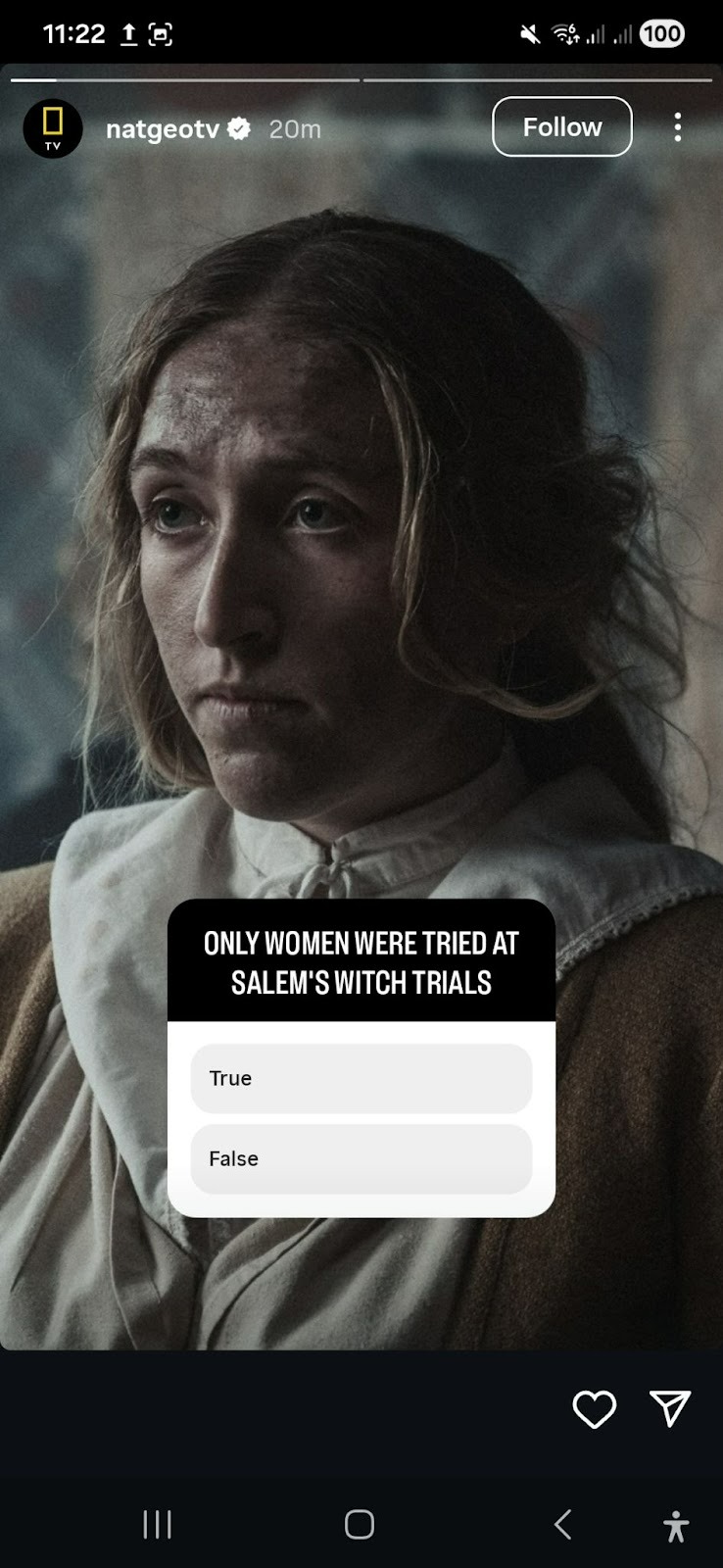 Example: National Geographic uses Stories to teach history through interactive quizzes about the Salem witch trials. They first share an interesting fact about the trials, then follow up with a true/false quiz question to test what followers learned.
