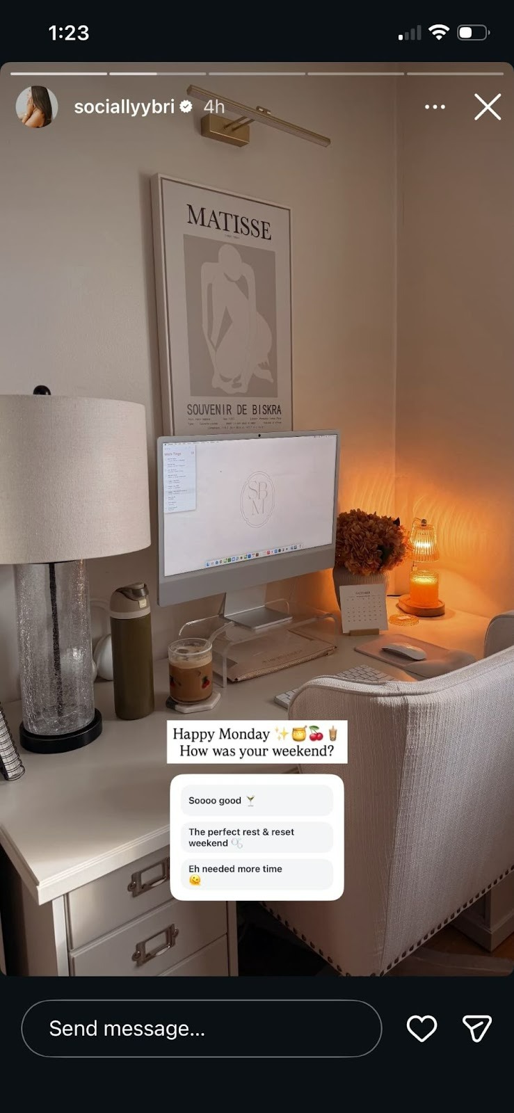 Example: The Social Ashton shares behind-the-scenes moments from her daily work as a social media strategist. In this Story, she shows herself starting her morning with a discovery call, giving followers a peek into her screen during the actual meeting.