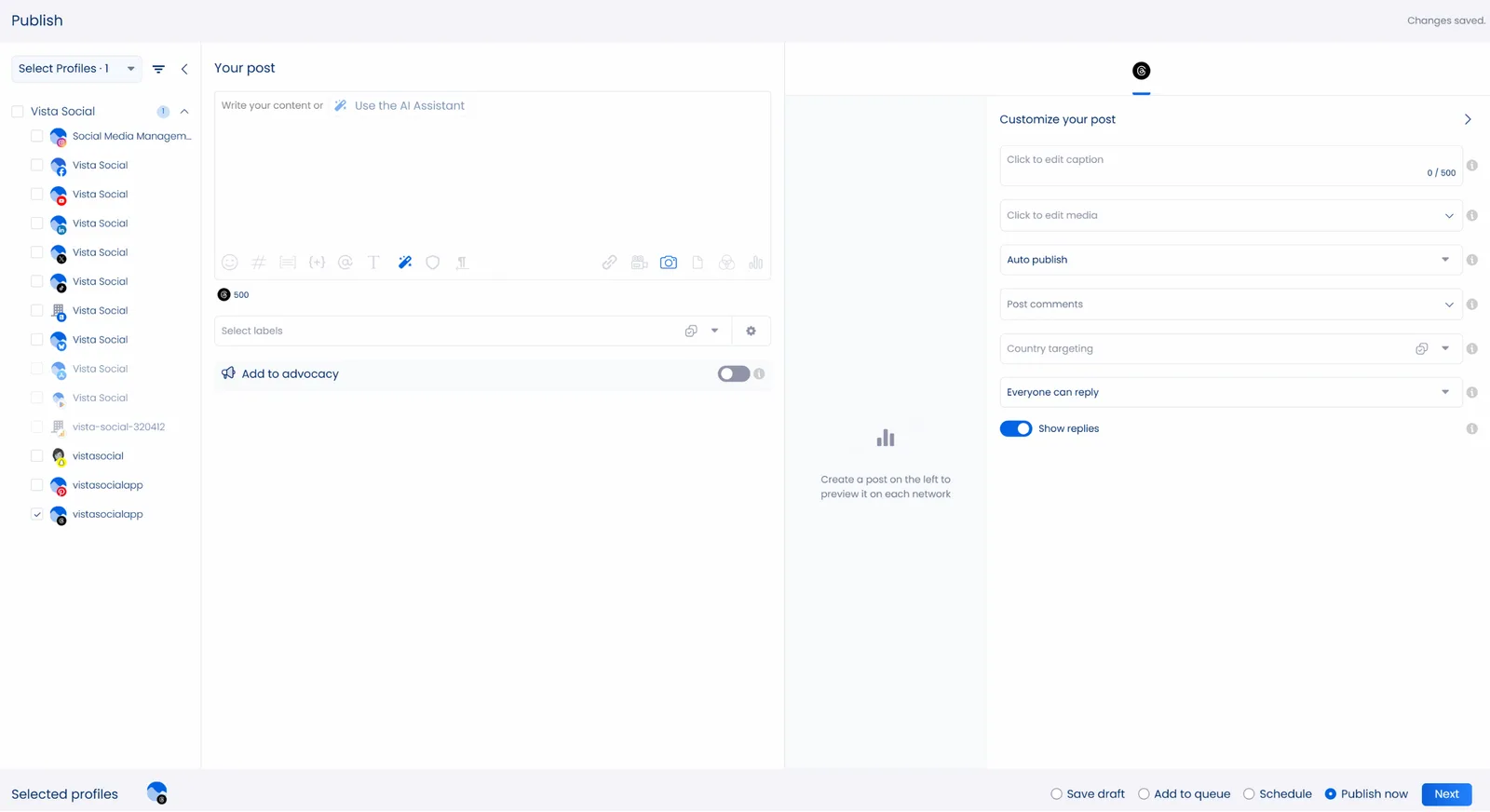 You can streamline your Threads and Instagram content planning with Vista Social, especially now that both platforms play a bigger role in daily conversations. If you want an easier way to handle everything across Threads and Instagram, Vista Social gives you a setup that keeps your process simple.