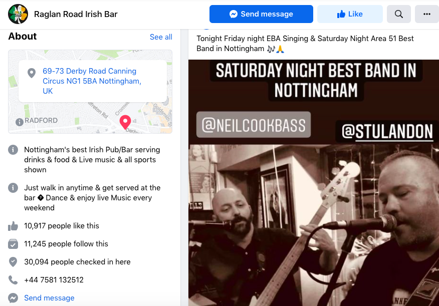 Except for general information such as a physical address, contact number, open hours, Raglan Road Irish Bar also directs customers to the restaurant’s delivery and pickup services in the About section. Also, it is worth paying attention that the chatbox opens as soon as the user lands on the bar’s Facebook profile.