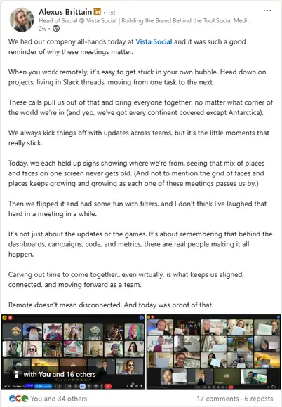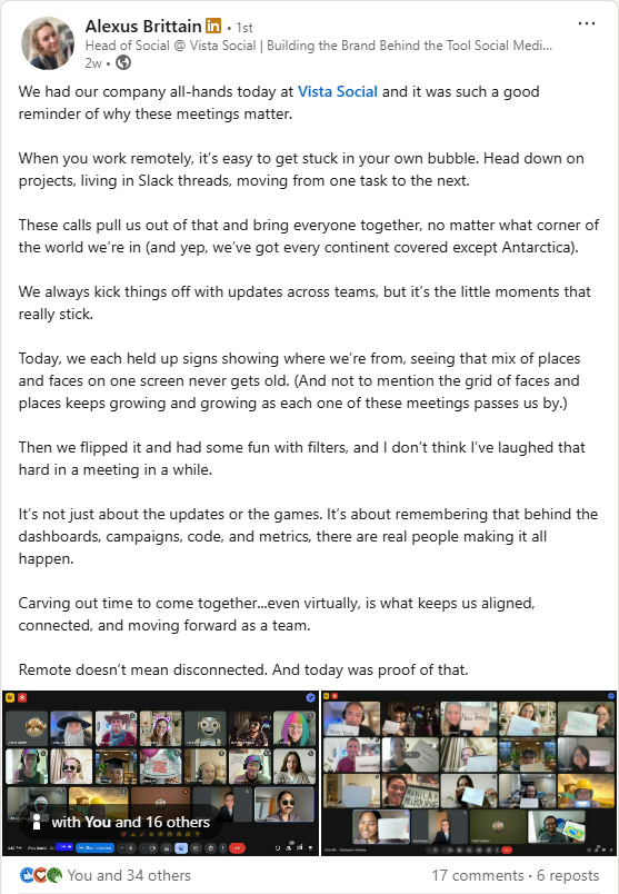 Here’s a great example of what this can look like from our own team at Vista Social. Our head of social Alexus took a couple of screenshots from a recent company all-hands, wrote up a post about it, and tagged everyone involved.