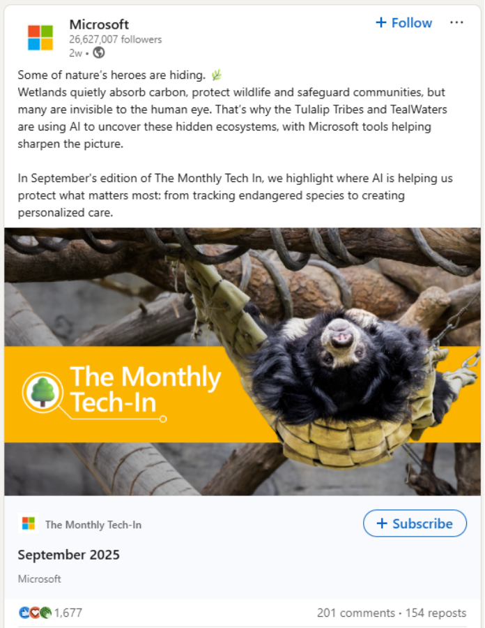 This post from Microsoft is a great example of a content type completely unique to LinkedIn—a newsletter. LinkedIn users and companies can publish newsletter issues, then create a post promoting them and boosting subscribers.