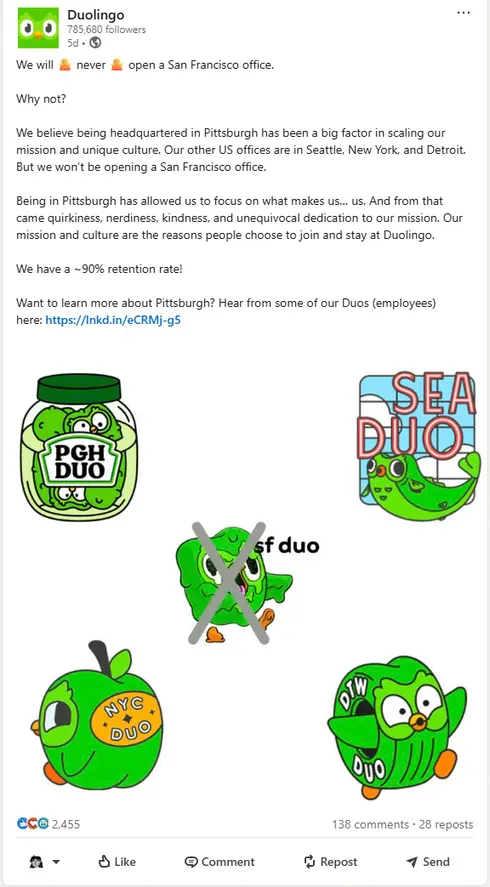 Duolingo shared an image post about the different locations its team has offices in. The engaging caption helps grab attention while sharing a bit of company culture as well.