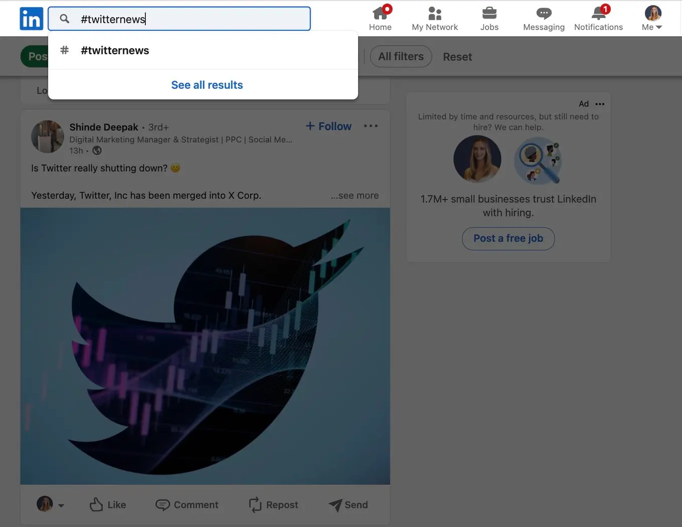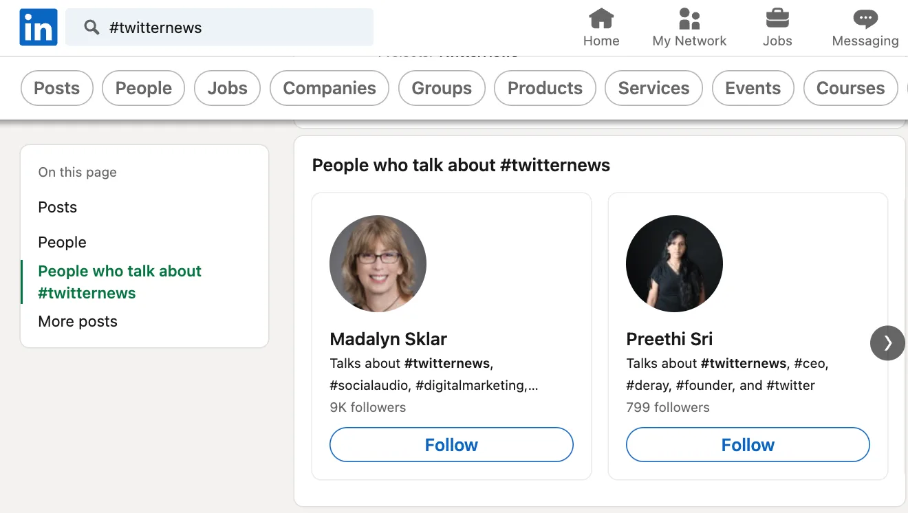 Hit Enter (or Return on a Mac) to check out the hashtag you searched for, or you can use this URL to go directly to the hashtag’s results page: https://www.linkedin.com/search/results/all/?keywords=%23twitternews