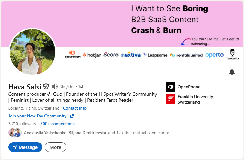 Hava includes relevant personal details that connect to her professional work and attract like-minded connections. The mix of professional role and personal interests creates a complete picture. This approach helps her stand out and build connections with people who share similar values.