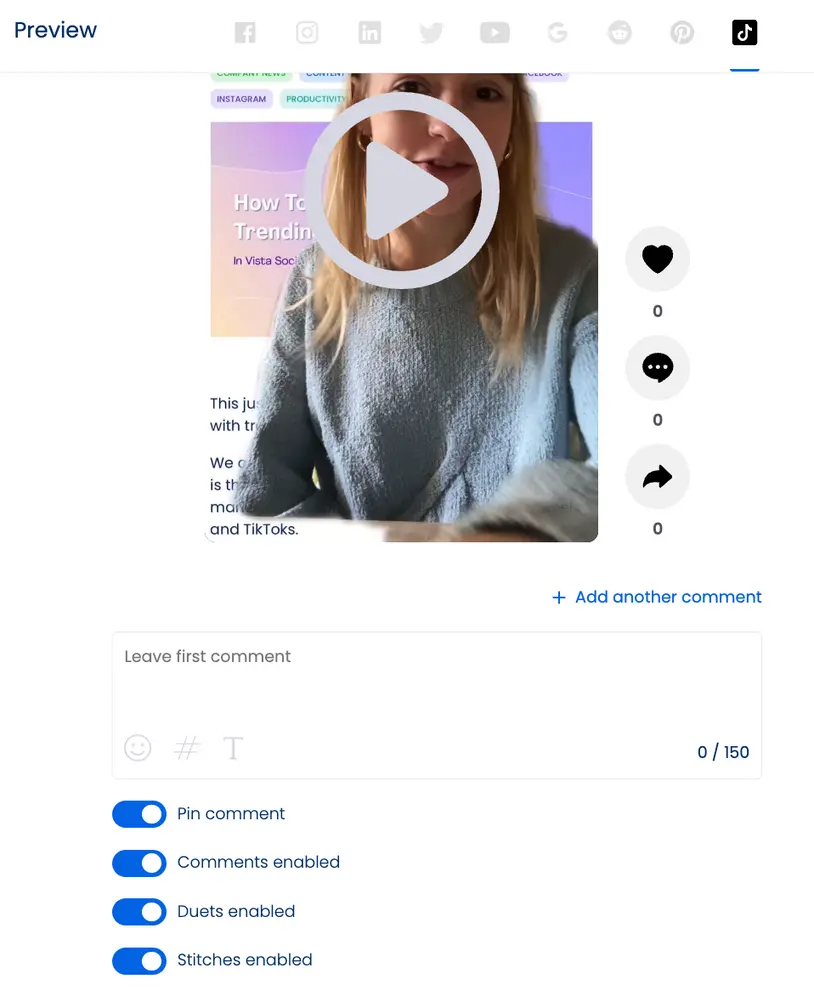 - Create their TikTok posts in Vista Social with content creation tools like VistaCreate.