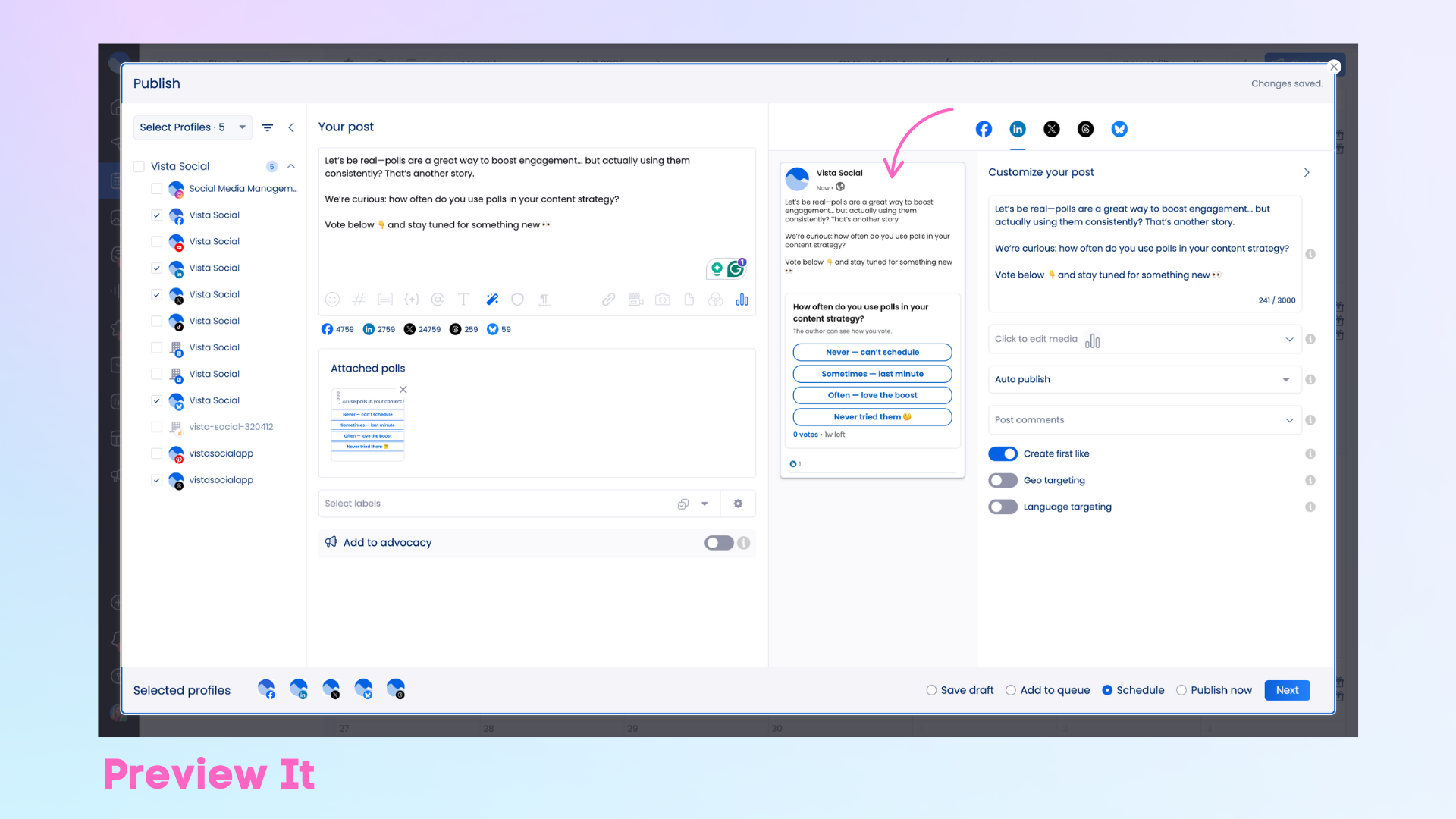 You don’t need to reinvent your strategy. You just need to add smarter, low-lift tools to it. With Vista Social, polls can now be part of your regular content rotation—scheduled in advance, automatically tailored to each platform, and optimized to drive interaction.