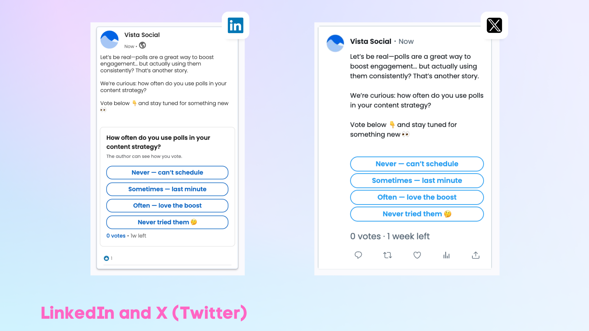Thanks to scheduling social media polls with Vista Social, you can now run polls in more places than most platforms allow—without workarounds. 🎉