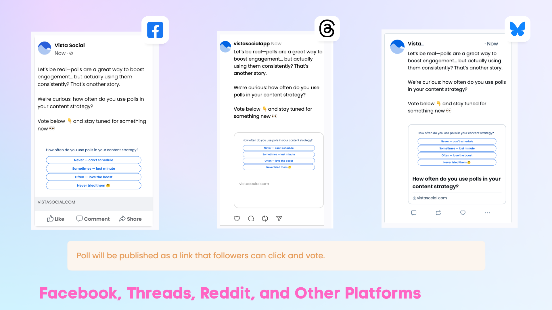 - For platforms that don’t have native poll functionality, Vista converts your poll into a visually engaging format—think an image post that appears as a poll linked to the voting options.