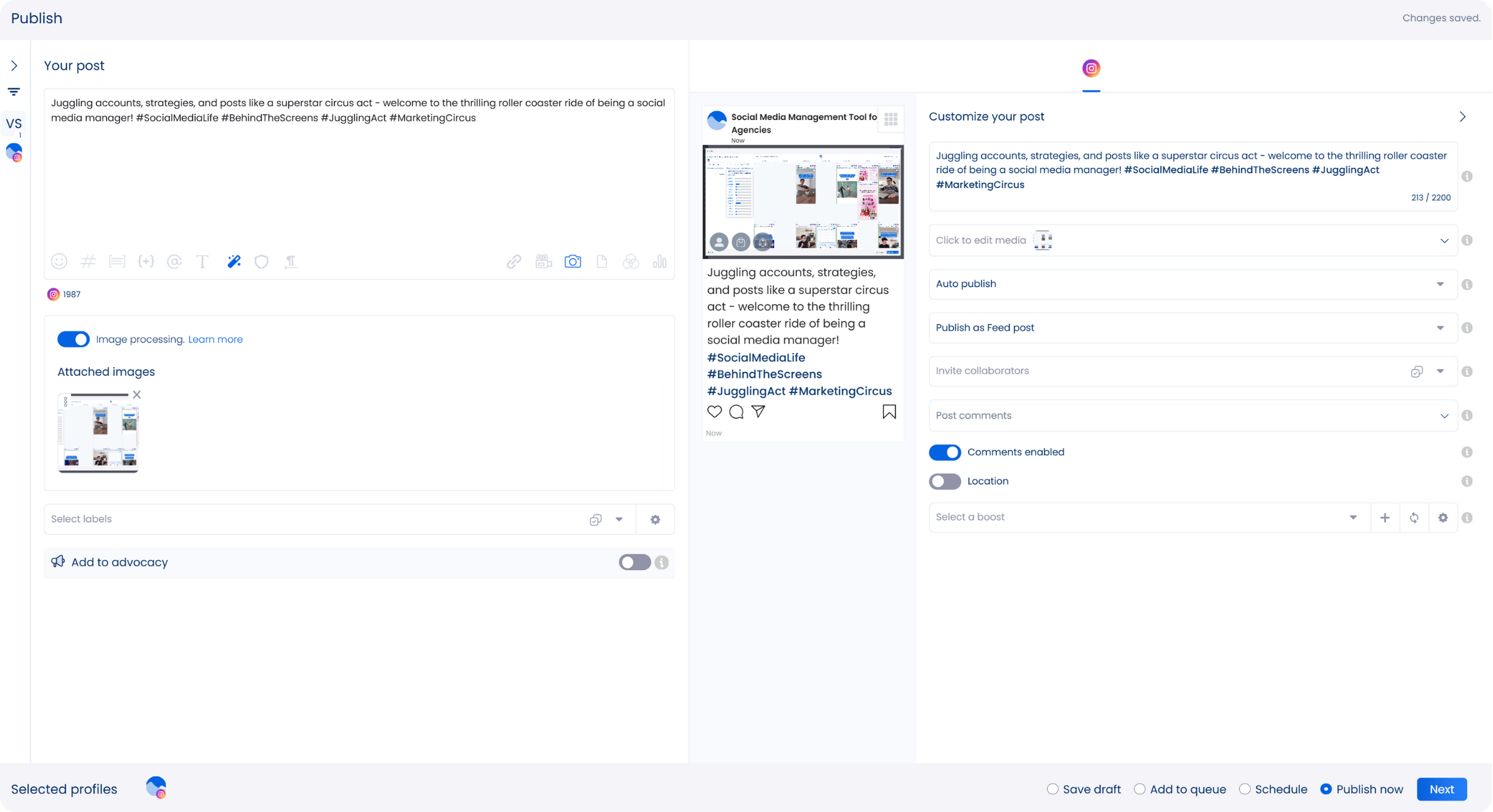 Fun fact: The Publisher lets you save mentions and hashtags for future use while also allowing location tagging or publishing as a Reel, along with other flexible posting options.