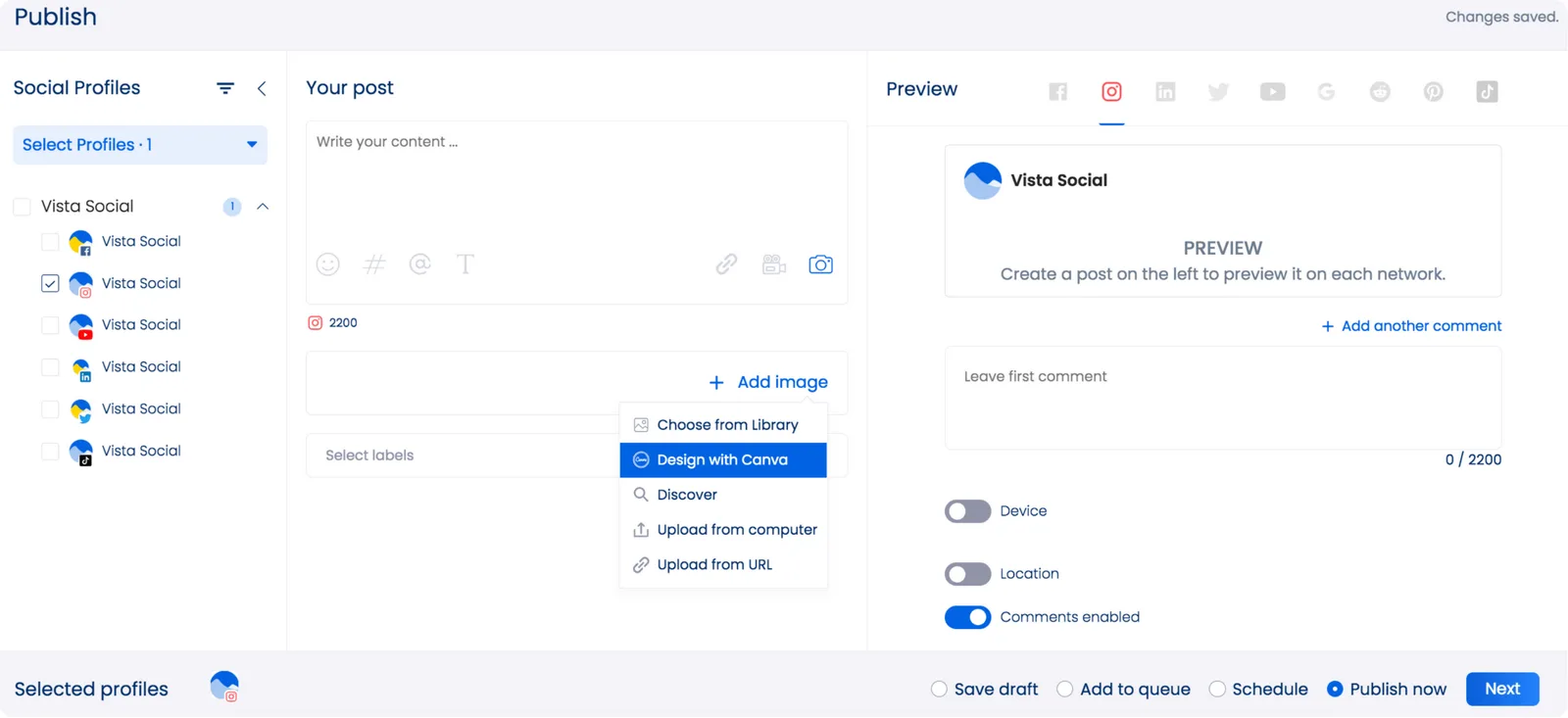 If you need to tweak your video before publishing, use the platform’s Canva integration for quick and easy editing. For Instagram-focused campaigns, pairing Vista Social’s scheduling tools with Instagram reels templates can make your workflow even smoother.