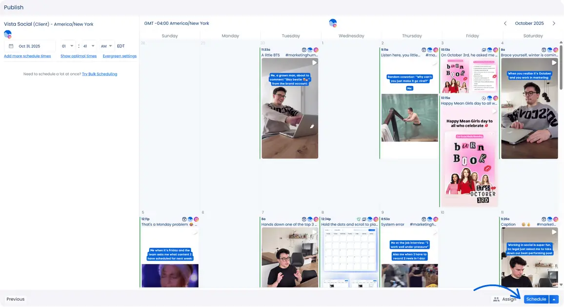 Vista Social’s AI Assistant can automatically generate captions and transform longer videos into shorter, more engaging formats that are easy to share. With the platform’s social media publishing feature, you can create and customize your clients’ videos, then schedule them to publish automatically across their profiles.