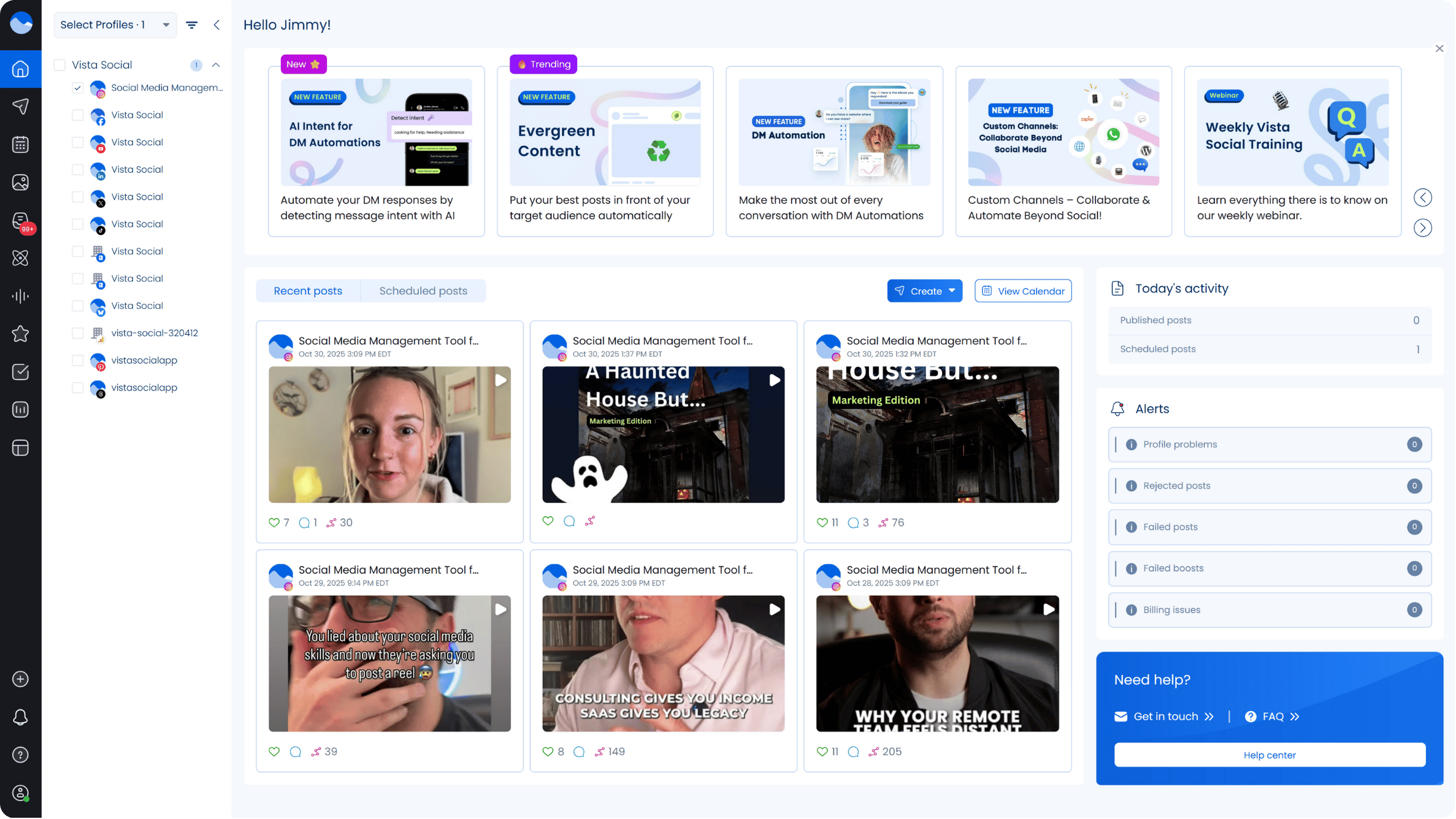 You can also check your recent and scheduled posts from the main dashboard, along with your content calendar and any alerts or activities tied to your accounts.