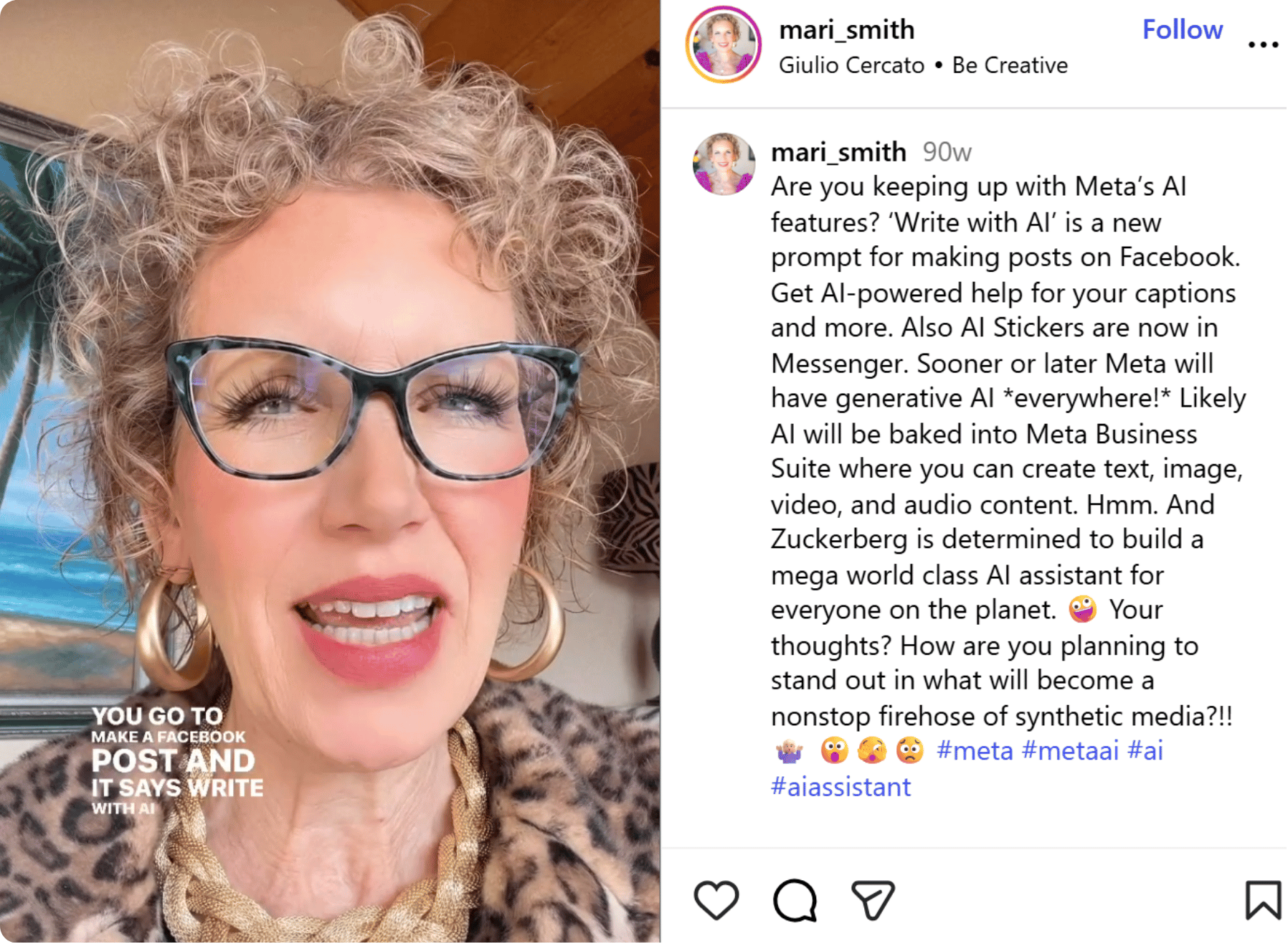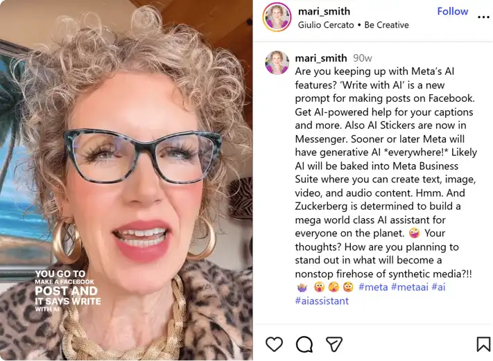 The Instagram Reel shows Mari Smith’s hot take on the new Meta AI features and what this means for content creators and user interactions. The video is an example of an industry expert sharing their opinions or thoughts on topics that will shape and shift the future of specific industries.
