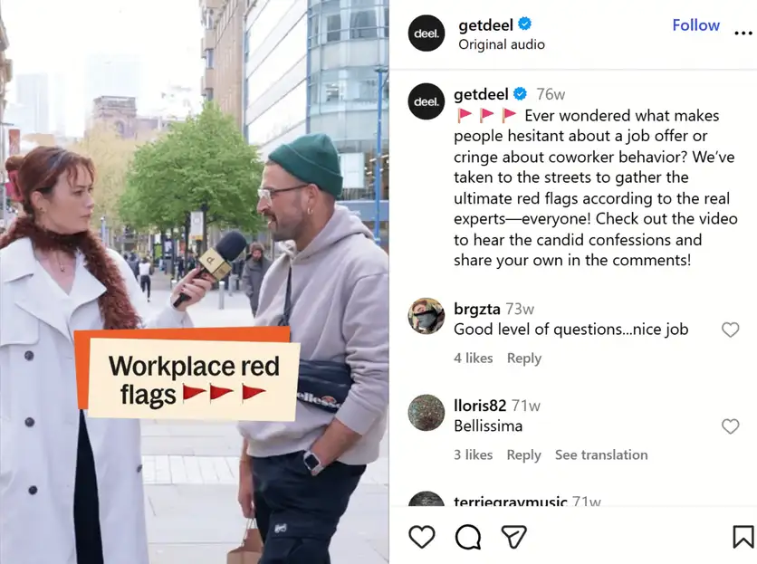 The content can be as simple as stopping people on the street and asking them about their dream vacation or which came first, the chicken or the egg. Deel’s street interview asks people about their opinions on workplace red flags.