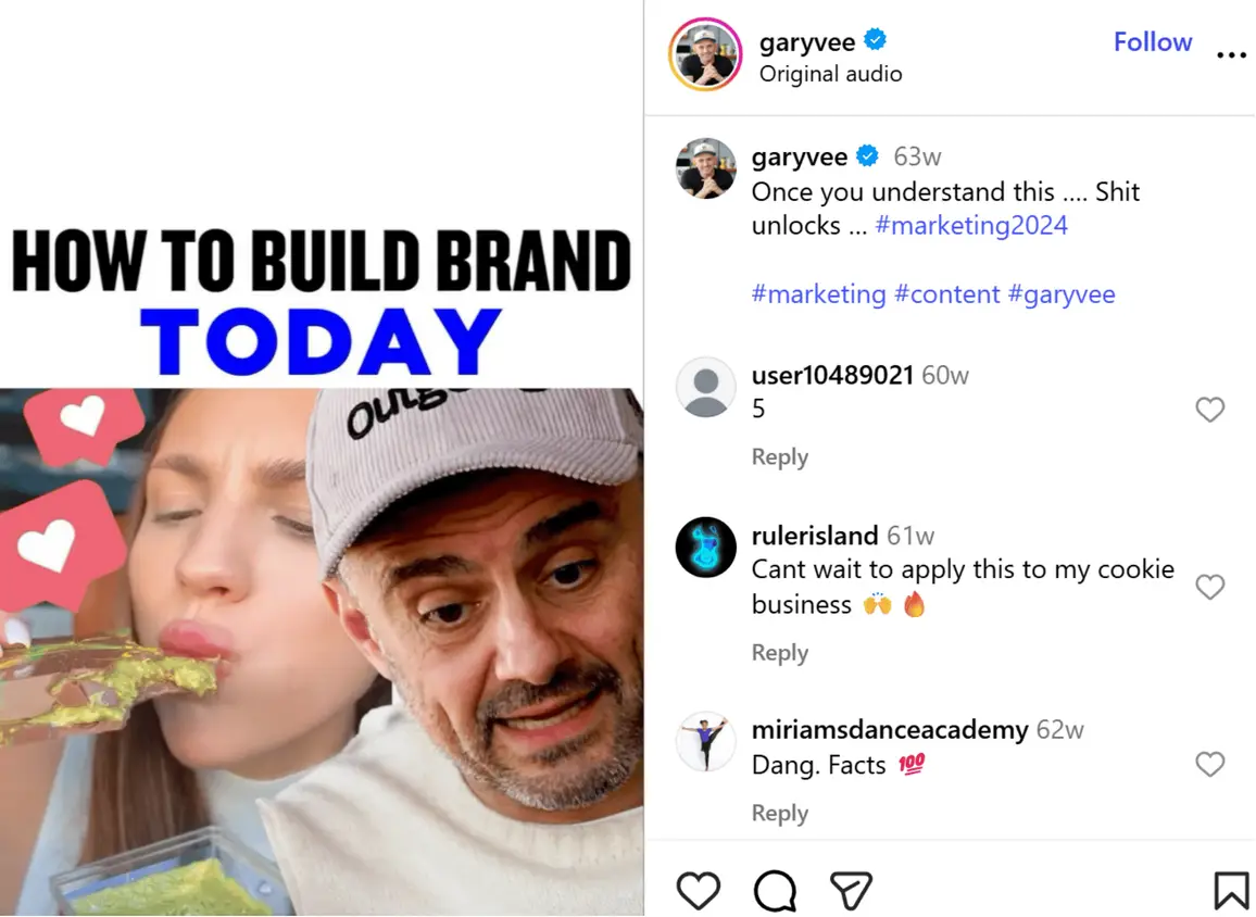 A classic example is entrepreneur and internet personality Gary Vaynerchuk’s Instagram Reel, which discusses building a brand on social media.