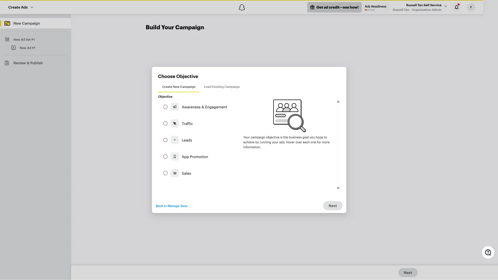 Once you’ve properly filled out the initial details, you should be redirected to this page where you get to build out your campaigns. Simply select your objectives and start creating ads for Snapchat!
