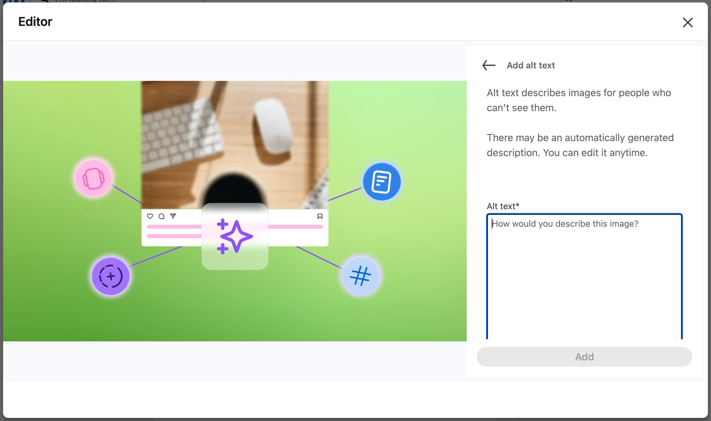LinkedIn’s alt text feature works similarly to other platforms but with a professional focus. When adding alt text to LinkedIn posts: