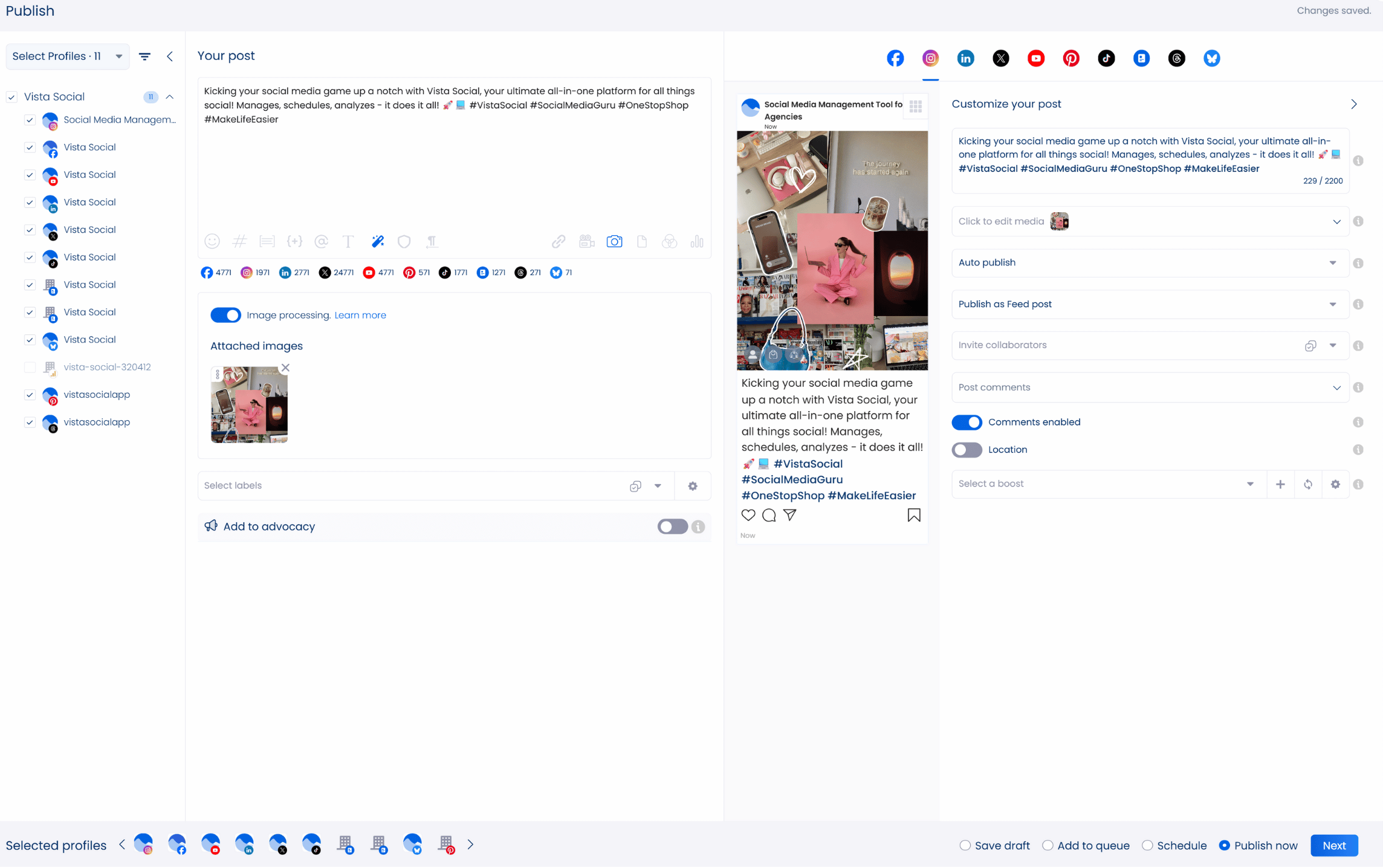 Once you’ve set up your content, you can decide which social media platforms it should appear on with just a single click. From there, you can add a few personal touches like enabling comments, tagging locations, or adjusting your text formatting to match your brand’s tone.