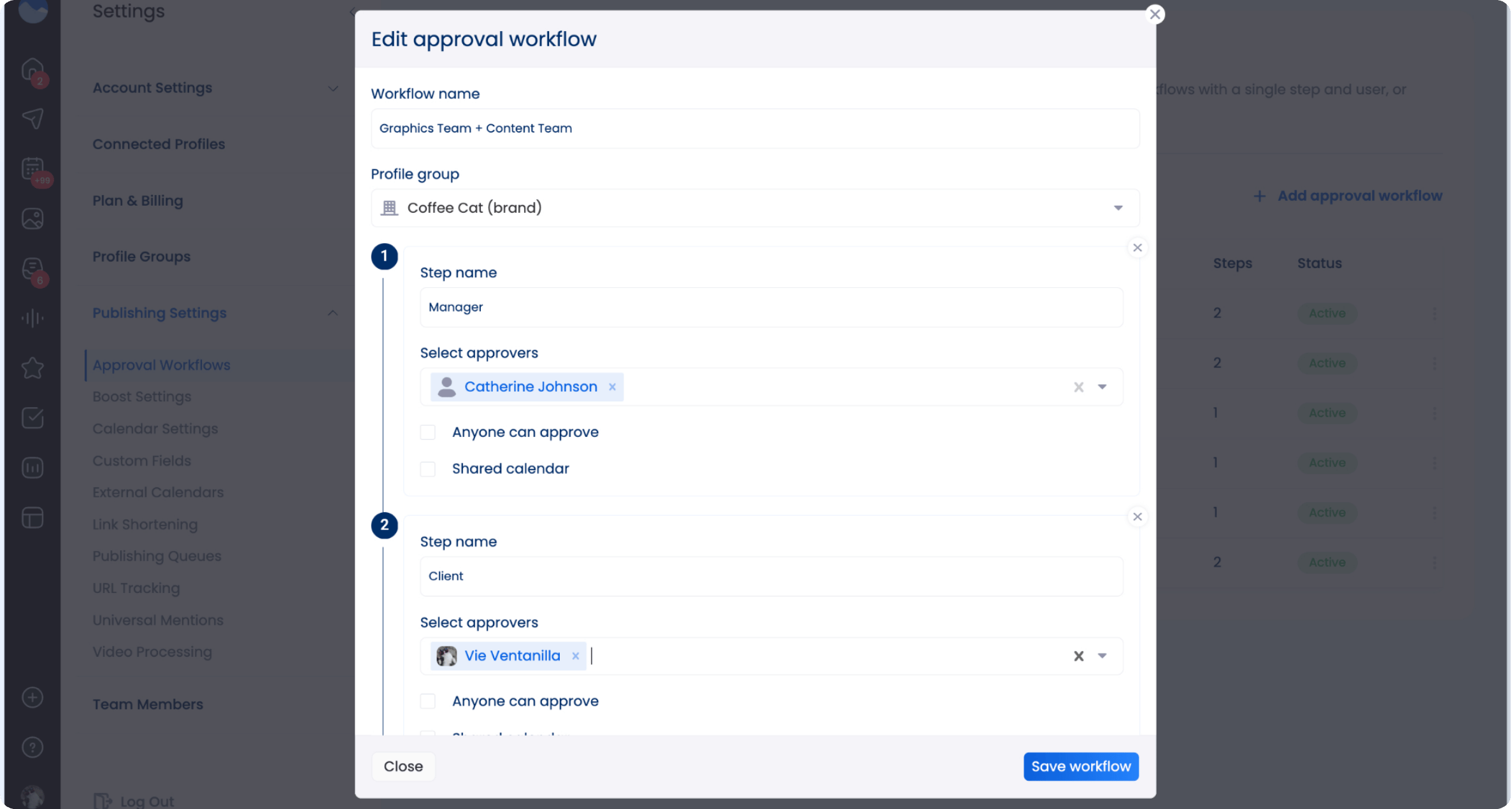 Vista Social lets you set up automated single or multi-stage approval workflows so you can easily share posts for review and give approvers access to your Shared Calendar.