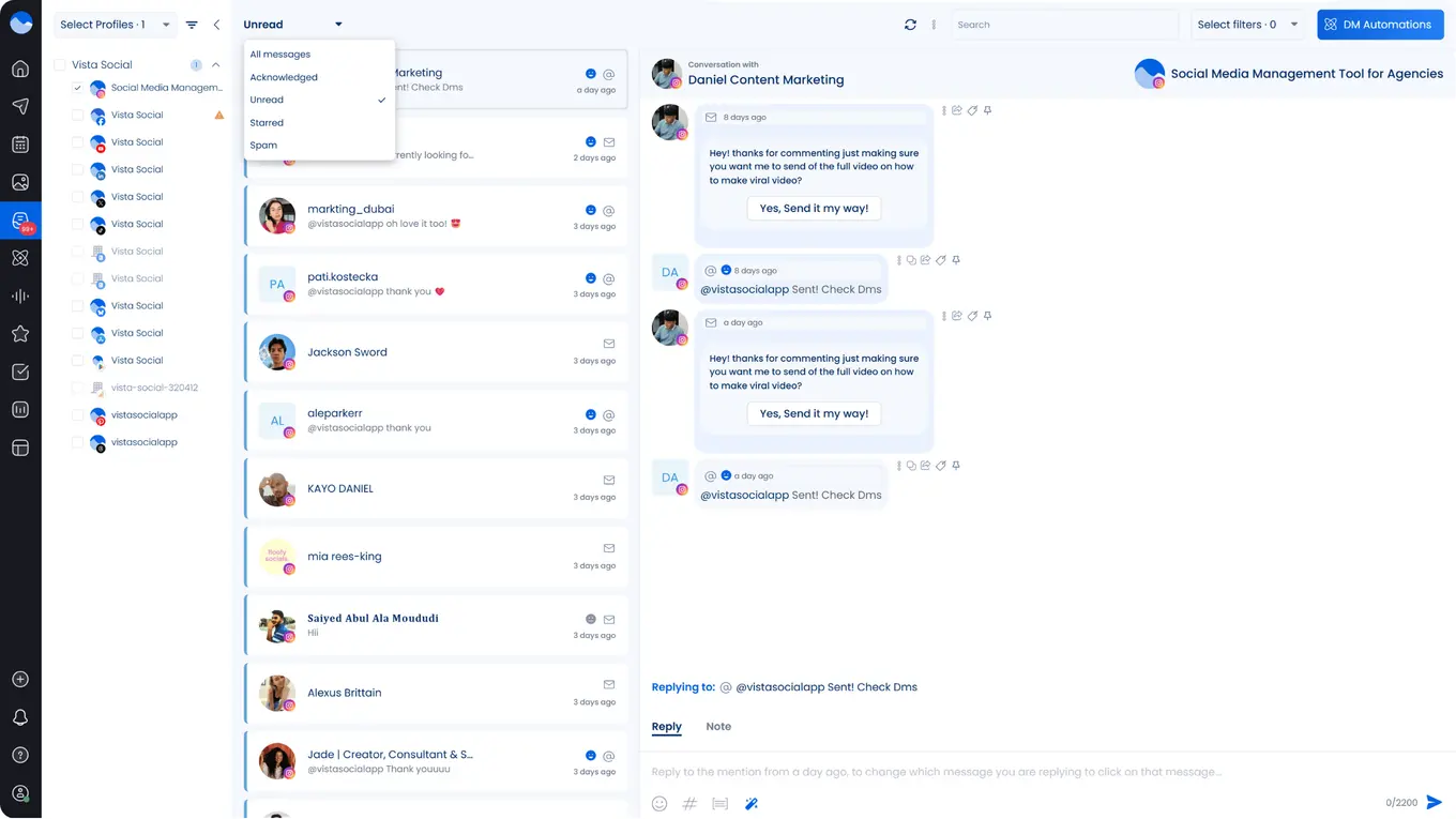 Manage your clients’ engagement like a boss with Vista Social’s social media engagement feature. It includes a unified Social Inbox that gathers everything your clients receive into one space so you can manage all activity more easily.