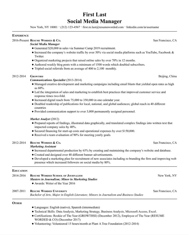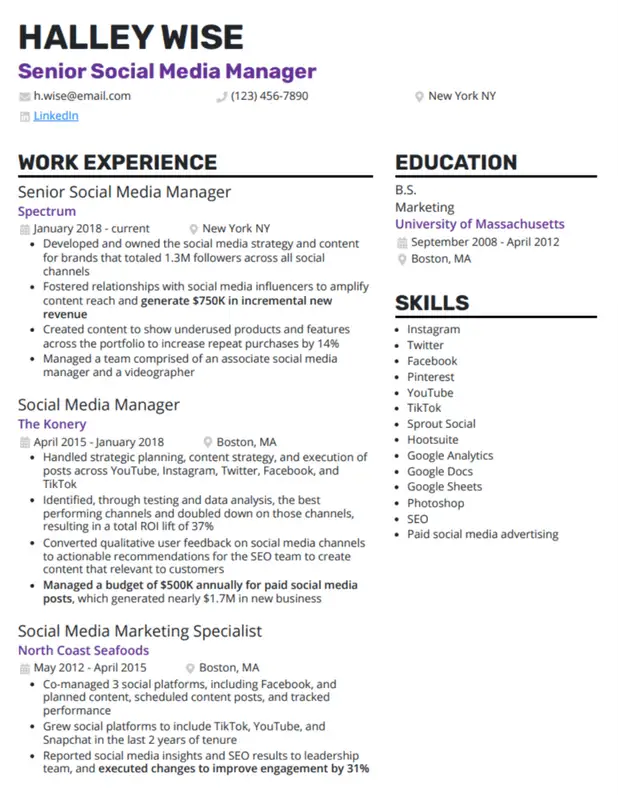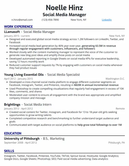 Prospects need someone with a proven track record in the field. Don’t just describe your roles and responsibilities in your resume’s work experience section. To captivate hiring managers, talk about the results you achieved with your social media skills.