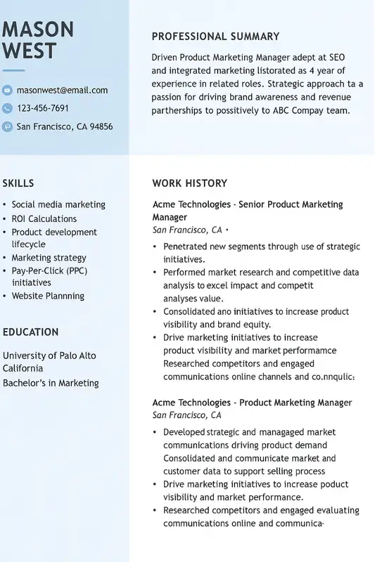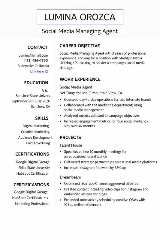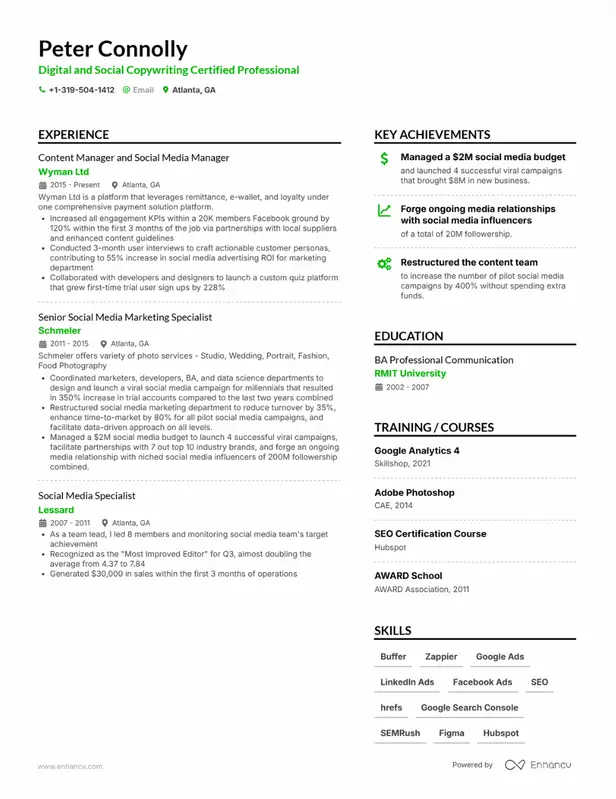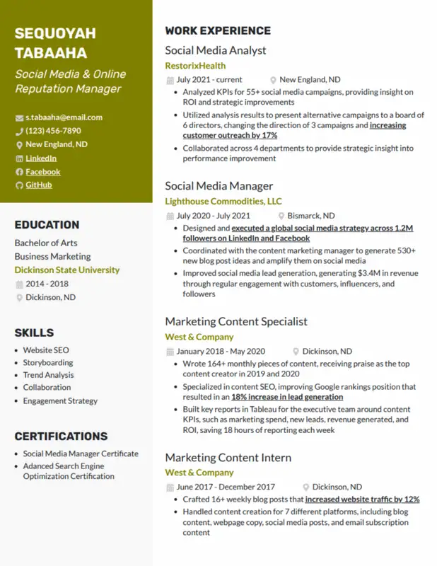 Notice how it specifies details like incremental new revenue, follower growth, plus the wider social media team. The template also consolidates essential contact information above the fold. This is useful for employers who wish to move forward.