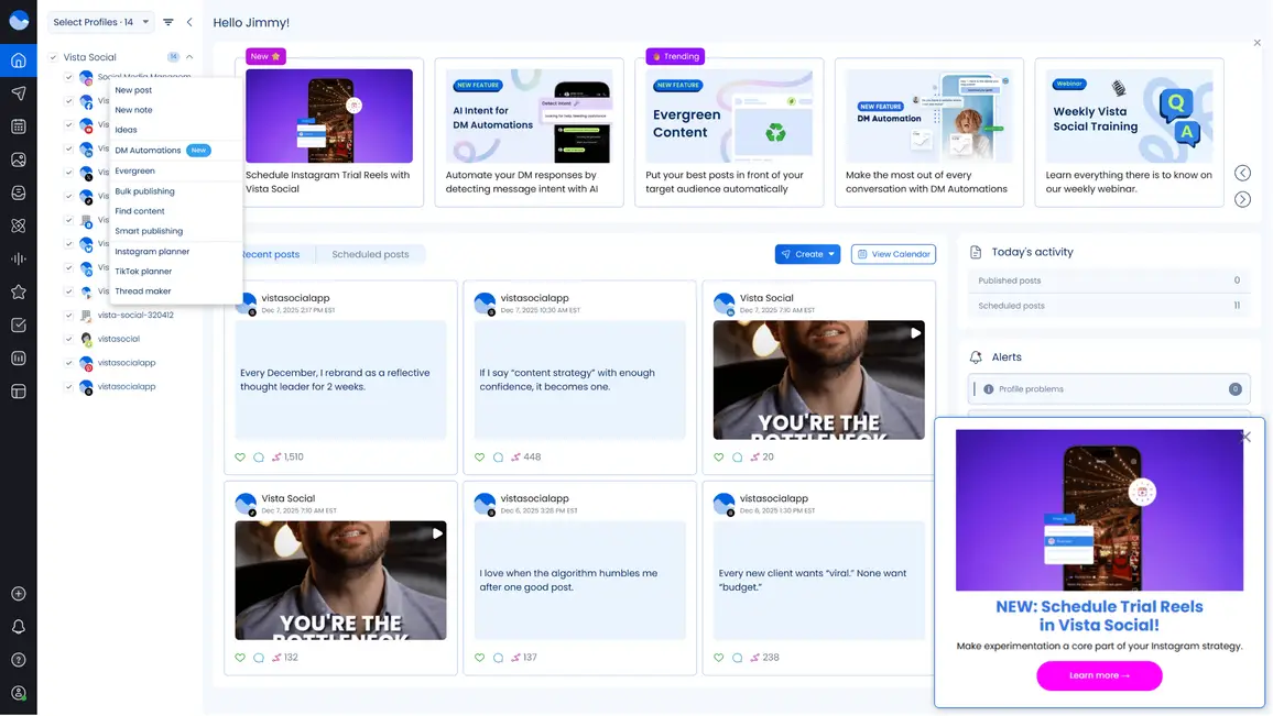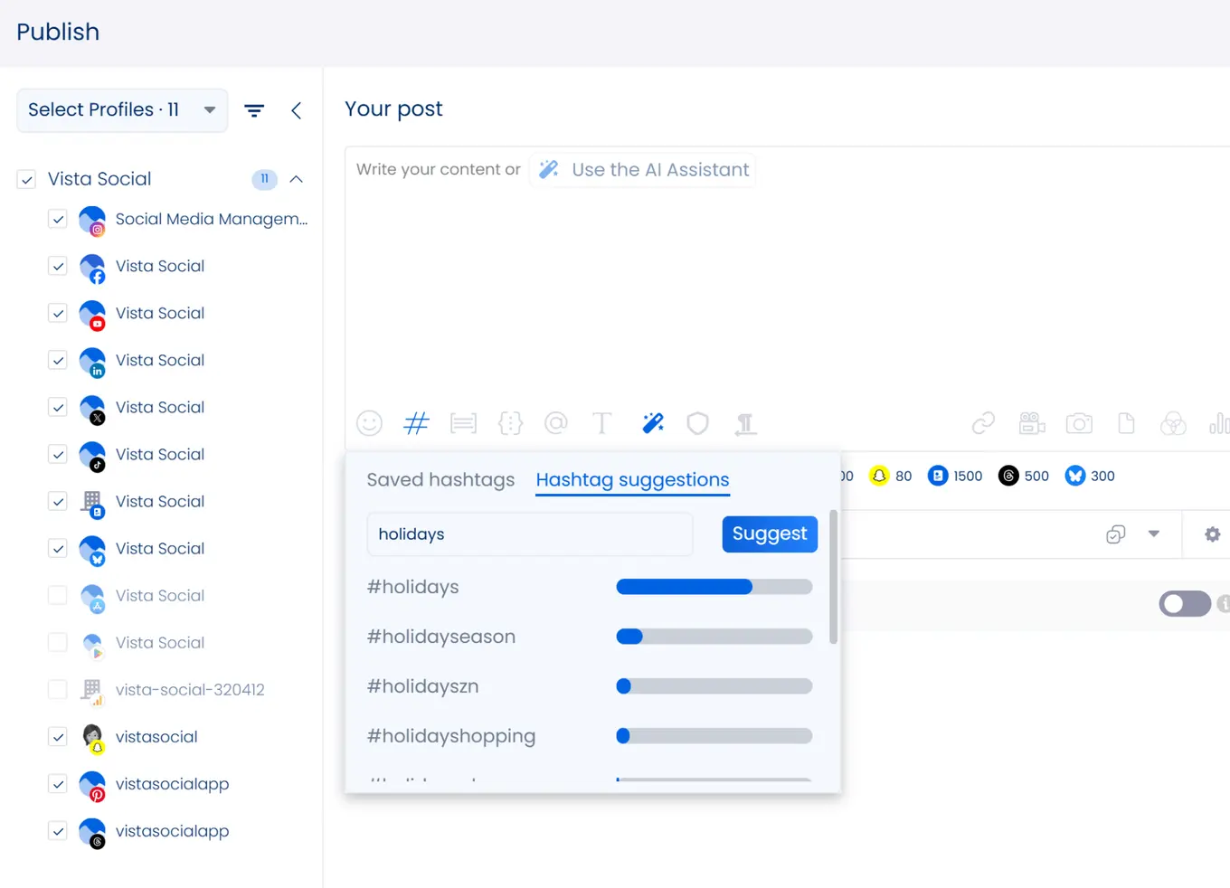 Inside the Vista Social publisher, you get access to viral hashtags for Instagram alongside TikTok audio when the feature is available in your region. You also control LinkedIn post language targeting while working with advanced scheduling tools that lift your content and give it a stronger chance to get noticed.