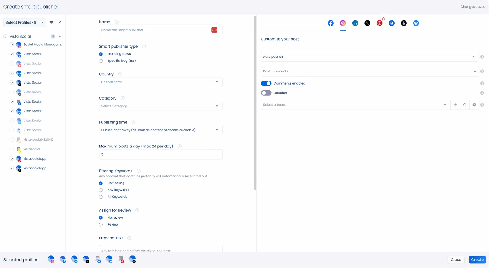 Publish your own content: Apart from curated content, Vista Social also lets you automate content from your own website. Share content about very specific topics, like “how to get more views on TikTok after posting.”