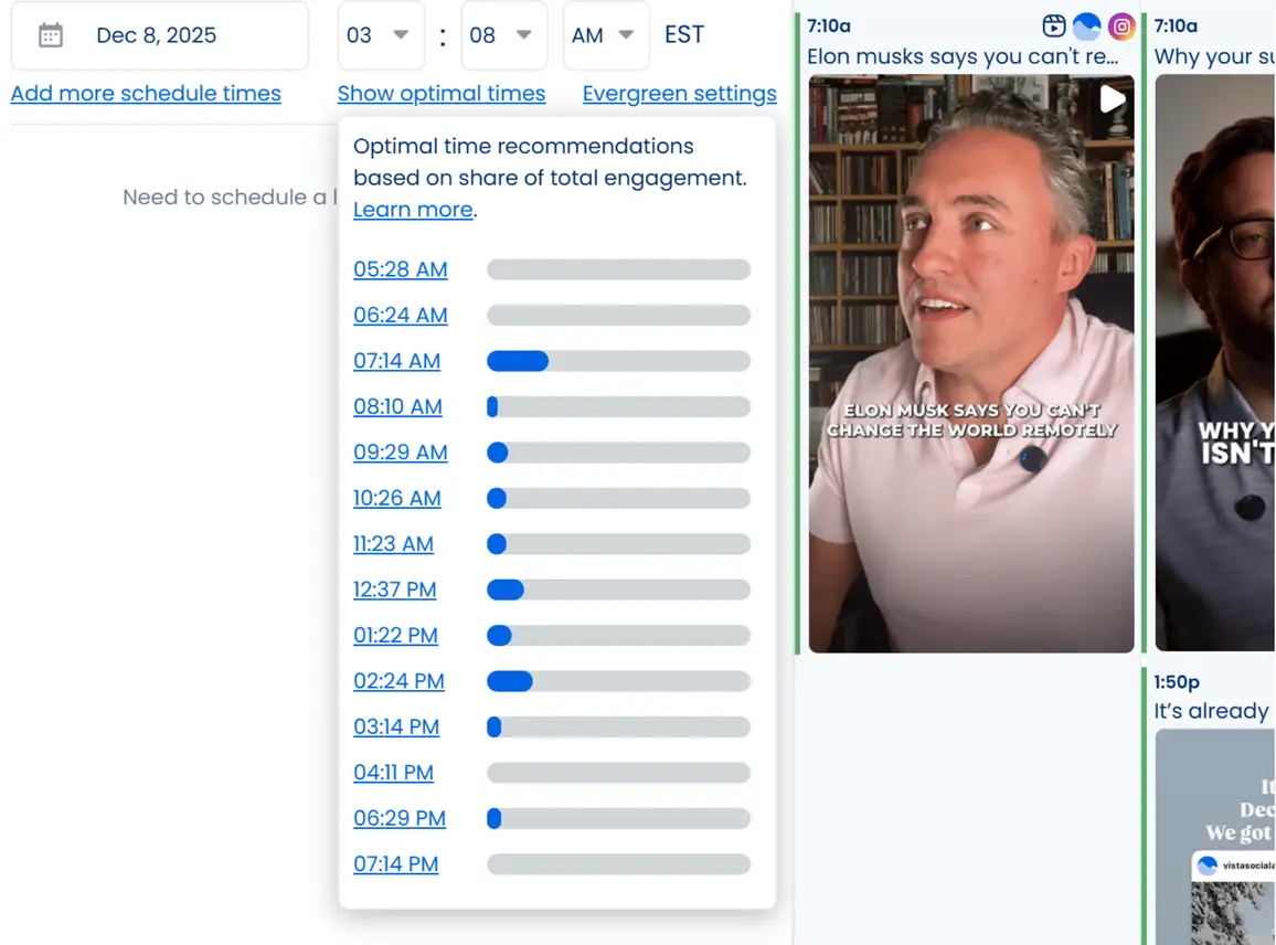 With Vista Social, you get enterprise-level social media publishing features that streamline content planning. The Smart Scheduler studies your previous posts to suggest posting times that help your content reach more people without guesswork.