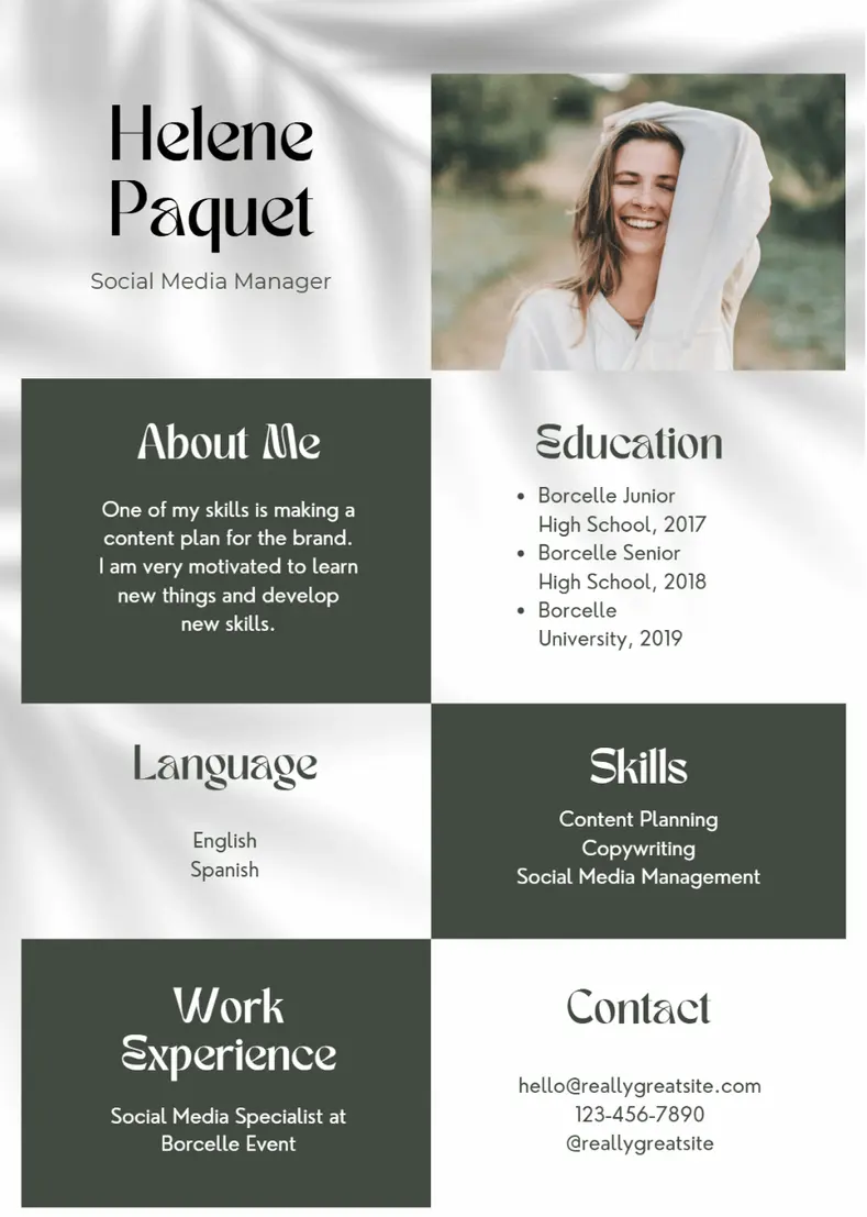 This next visual resume template from Canva may lack effective placeholders, but it more than makes up for it with its effective resume design.