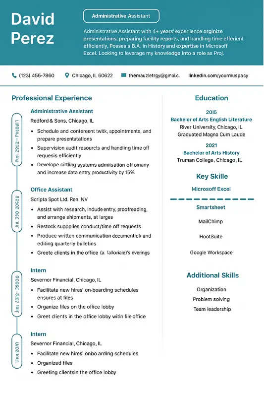 If you’re looking for a snazzy and surprisingly clean social media manager template, look no further than this one from Resume Genius. It effectively combines multiple graphic elements into one cohesive design.