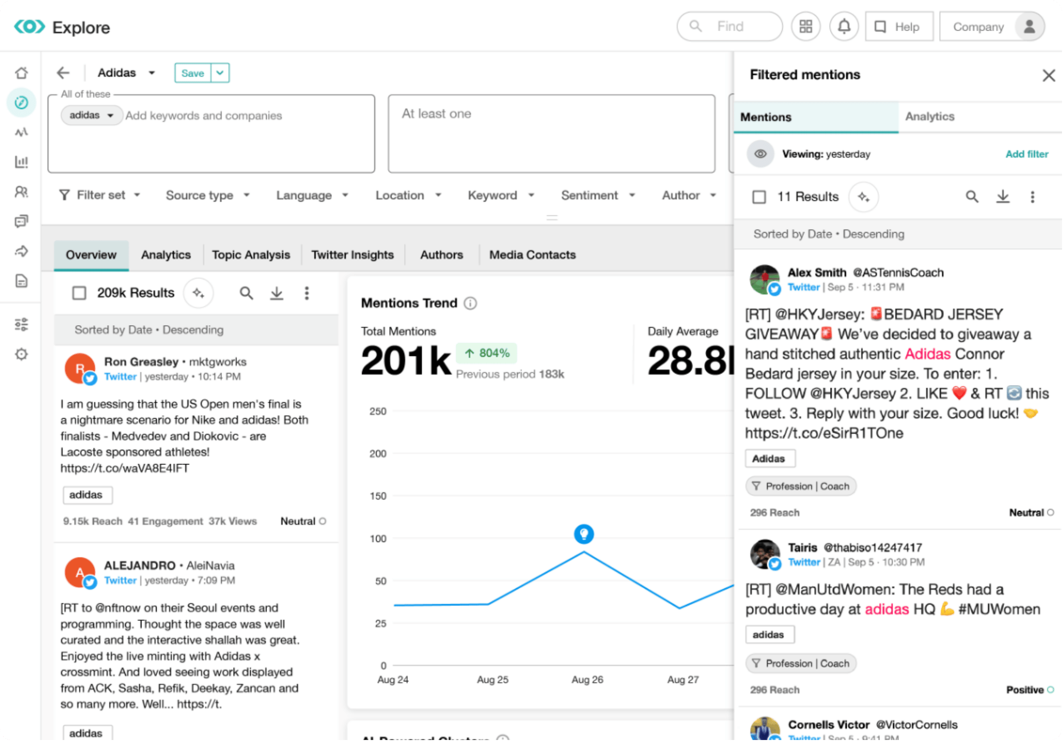 - Sentiment analysis that shows positive, negative, and neutral mentions
