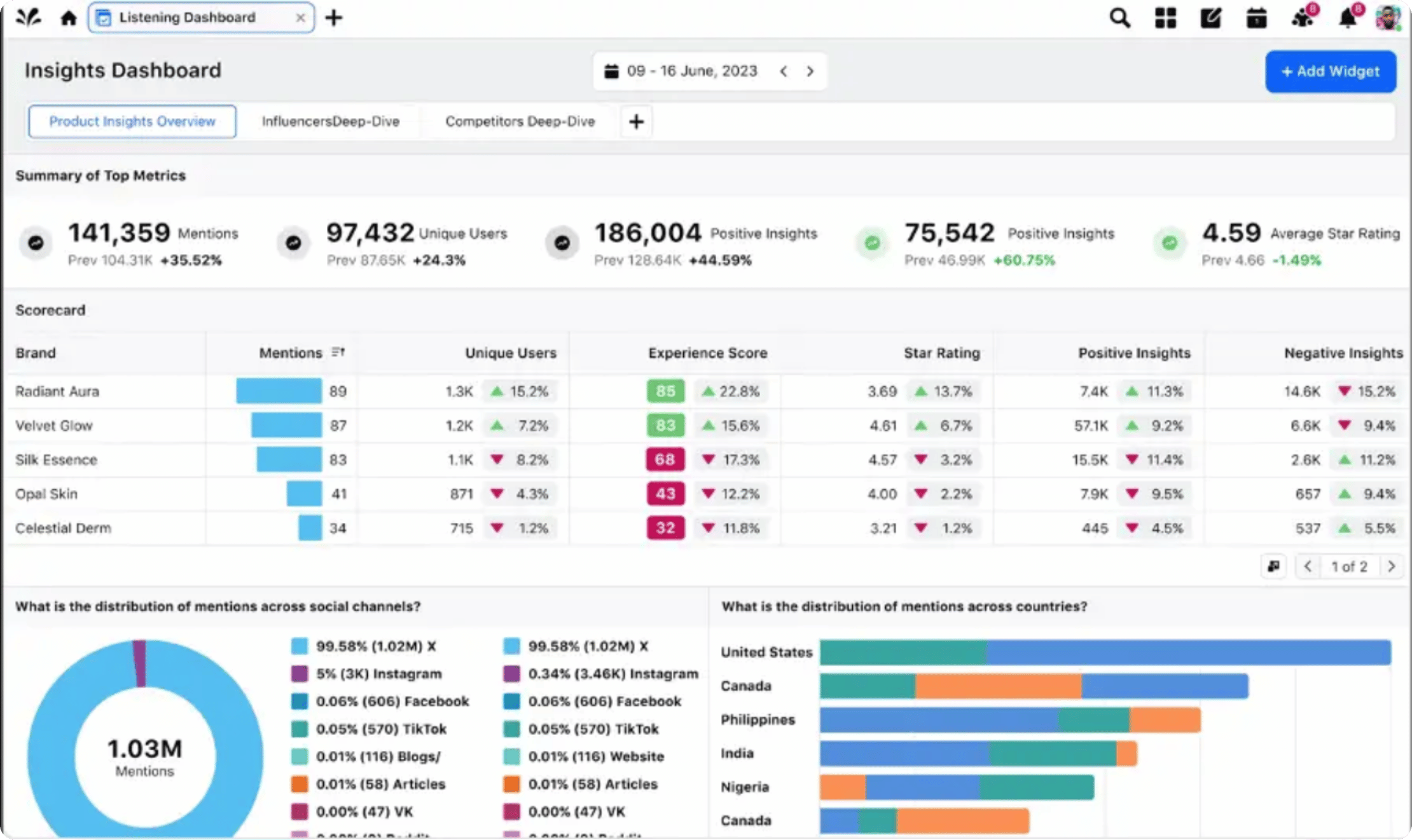 - Social listening capabilities, including mentions and sentiment from a broad range of sources