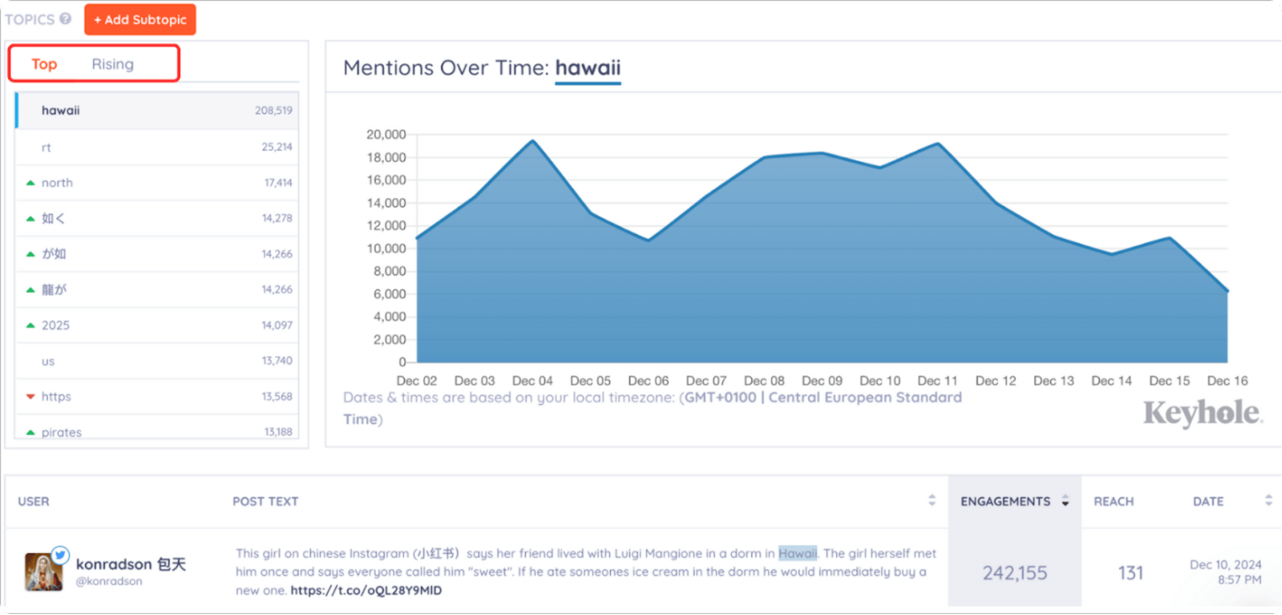 - Social listening capabilities, like trend monitoring and comparison of topics and brands