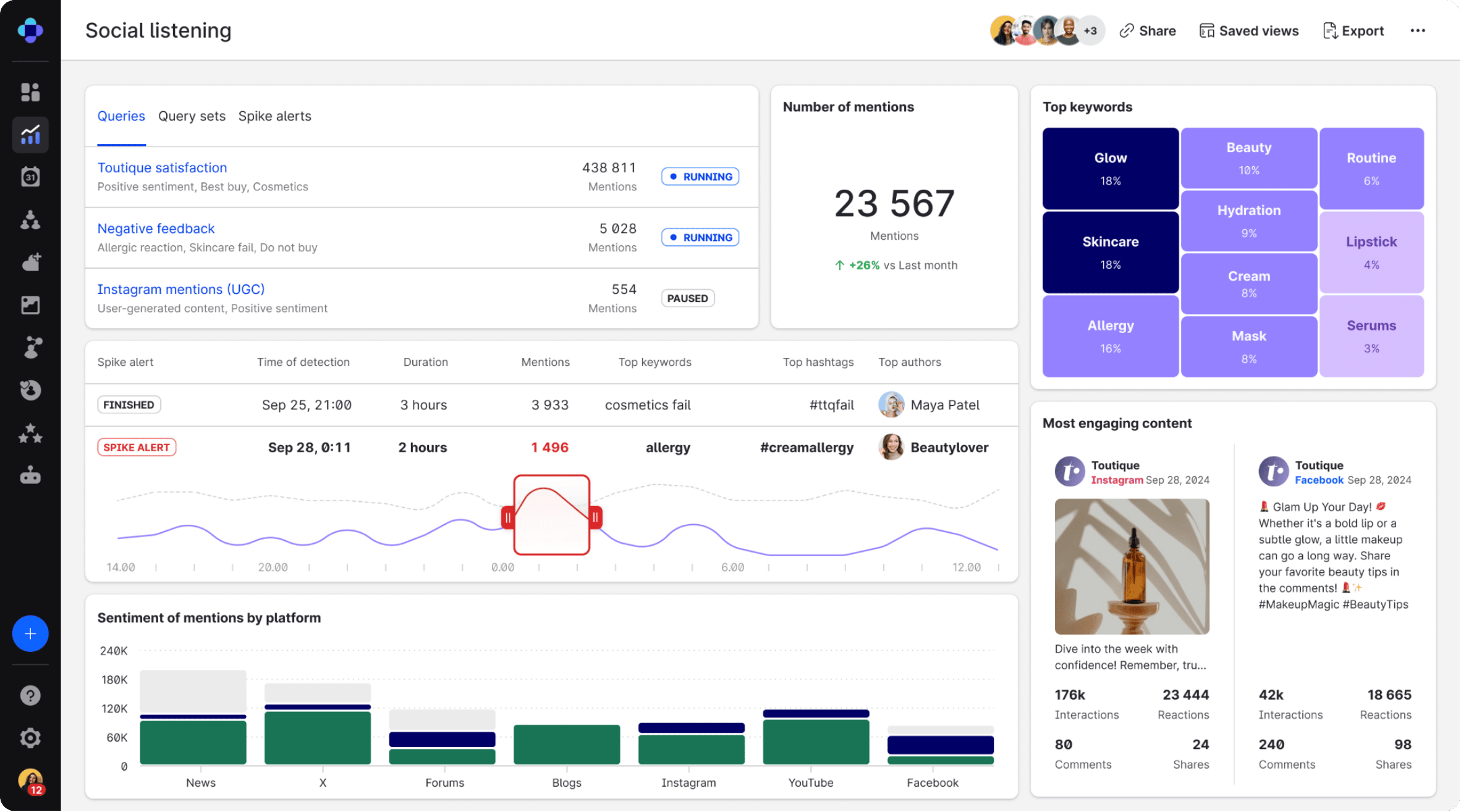 The tools pull in mentions and keywords in real time, giving you a clear view of how audiences perceive your brand online. Whether it’s a customer shoutout or a sudden sentiment spike, you’ll see it as it happens before it turns into a missed opportunity or a crisis.