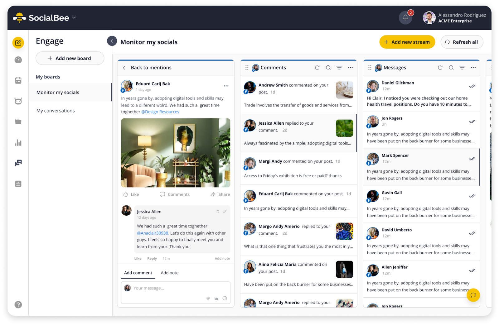- Features for managing mentions, comments, and DMs across all your social media accounts from one centralized dashboard.