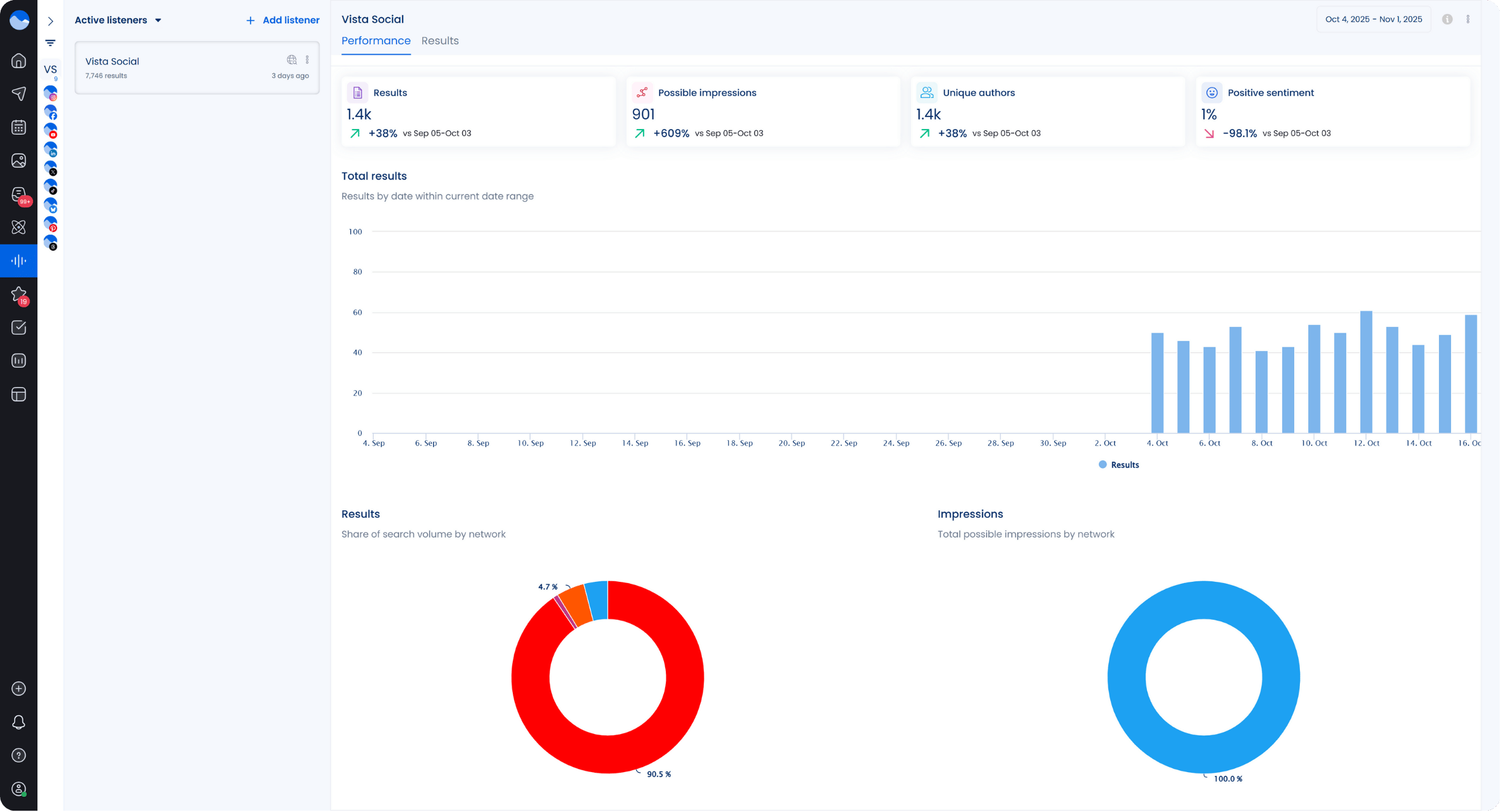 You can generate Listener Performance Reports to see how your social listening efforts perform across different networks. The report highlights total results and sentiment trends from key platforms. It helps you understand where conversations about your brand are happening and how people feel about them.