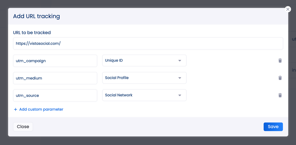 First, UTM parameter setup is your first step. Use Vista Social to easily set up your URL tracking parameters within seconds. Head to Settings > Publishing Settings > URL Tracking, and add each URL you plan to share on social media.