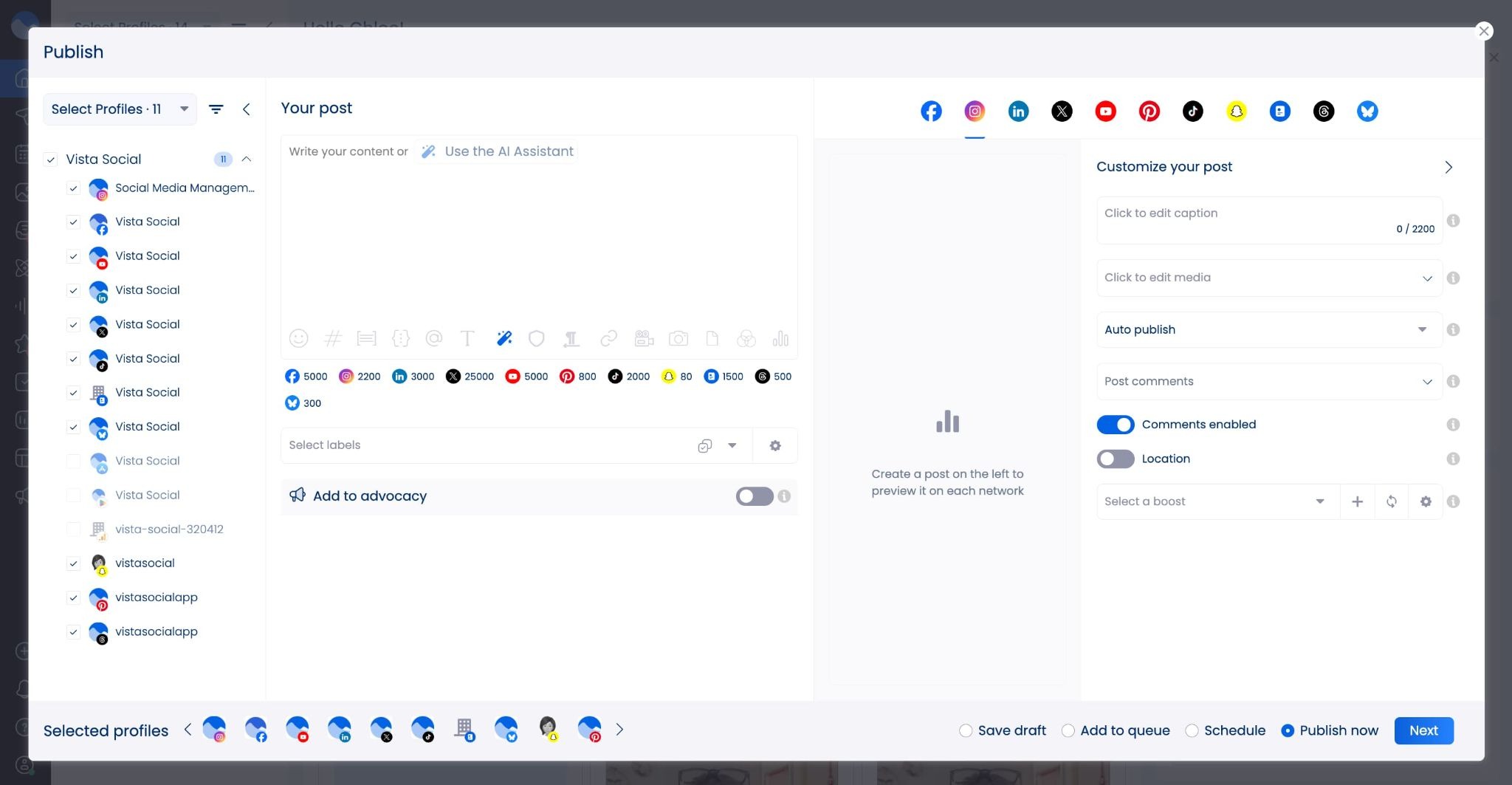 Vista Social makes this even easier because contributors only need to learn one workspace to publish across various platforms. When publishing, you simply tick the social icons for the profiles you want to post on. This increases the efficiency of your process, making your workflows much quicker and clearer.