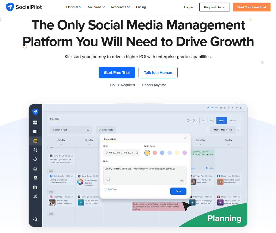 SocialPilot is one of the best social media management tools that allows you to streamline content planning, scheduling, publishing, and analytics. It supports multiple social media platforms including Facebook, Instagram, LinkedIn, TikTok, and Pinterest, making it ideal for businesses, agencies, and freelancers who want a simple yet powerful tool to manage all their social accounts in one place.