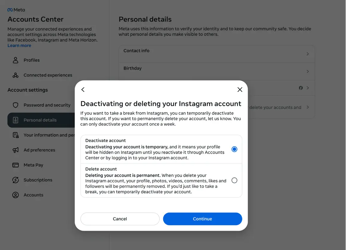 After you unlink the accounts, open Accounts Center, go to Personal Details, then select Account Ownership and Control. Most people now find the deactivation option inside Meta’s Accounts Center. Some accounts still surface an in-app shortcut, although Instagram doesn’t guarantee it for everyone. Accounts Center remains the dependable place to manage deactivation controls.
