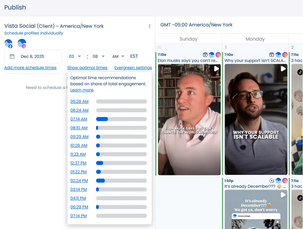 Start with a content calendar that’s based on their Instagram habits. For starters, use the Vista Social publisher to reveal the ideal posting times based on previous content engagement. Just click ‘Show optimal times’ when scheduling a new post.