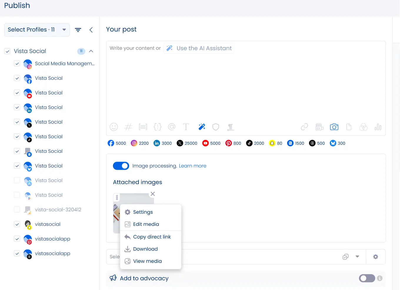 When in doubt, use Vista Social’s built-in image editor to nail every post’s formatting specs.